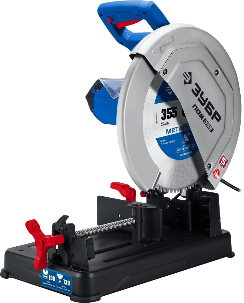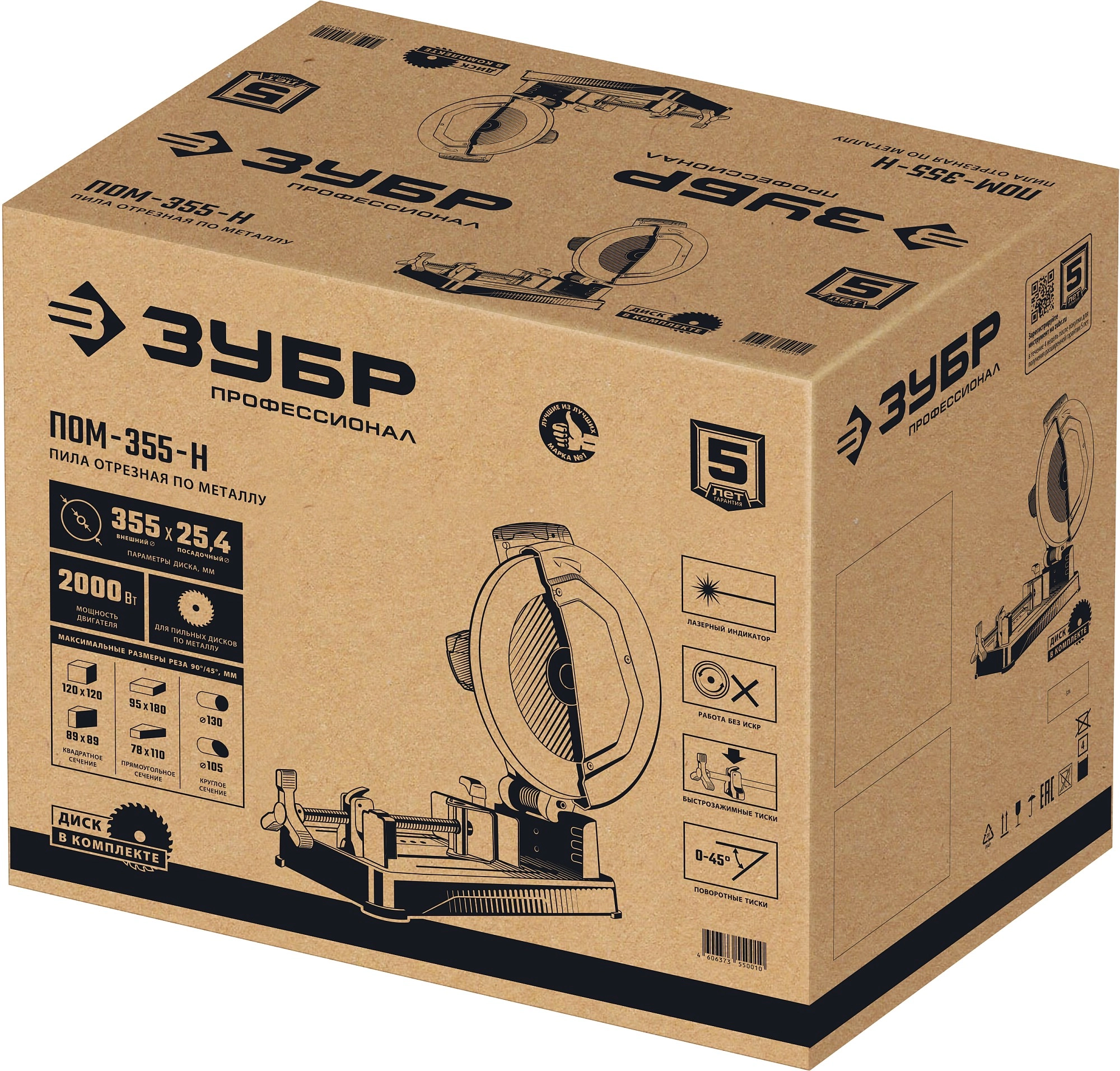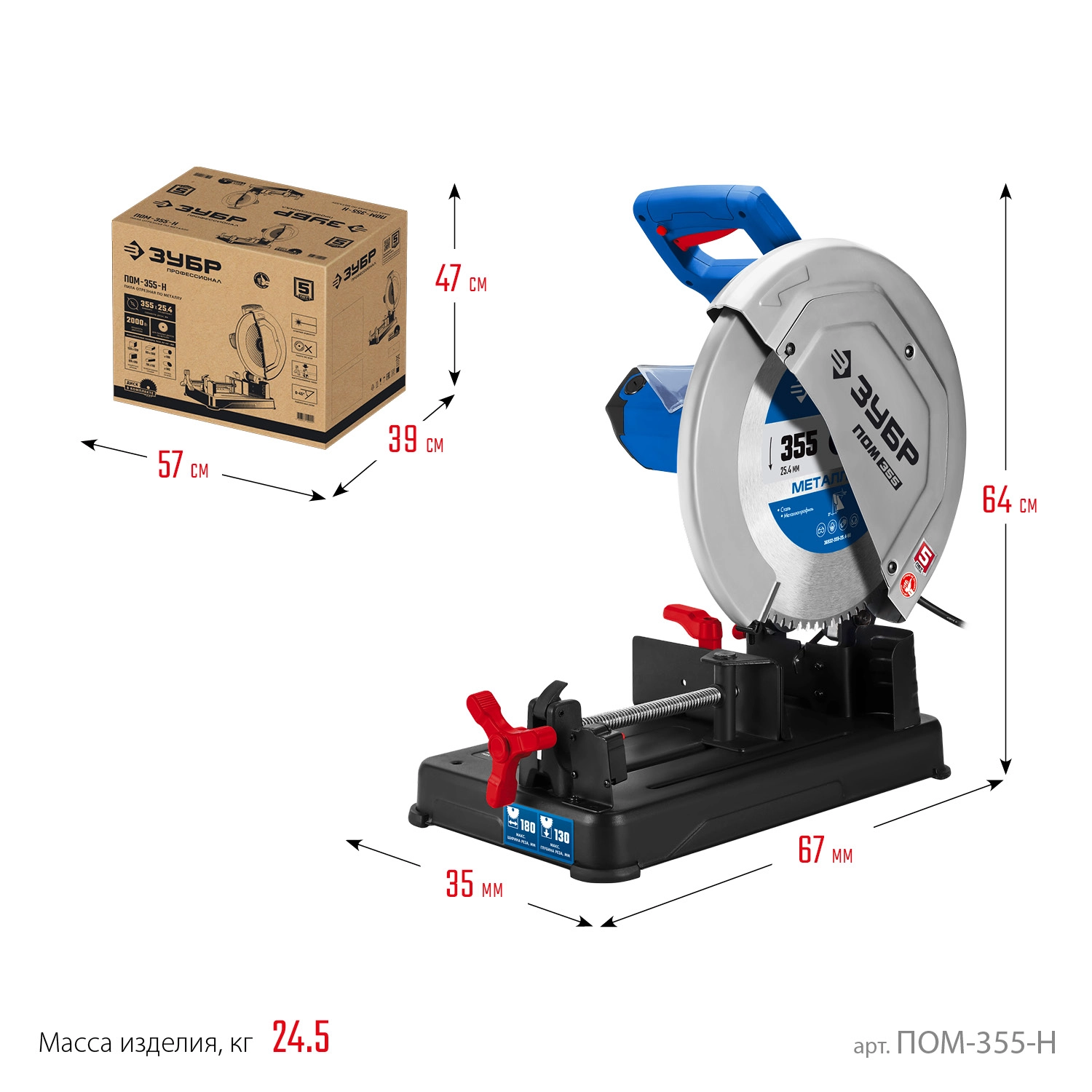 ПроизводителиПила отрезная по металлу ПОМ-355-Н с пильным диском (2000Вт, диск 355х25.4мм, рез 130мм, кор.) ЗУБР