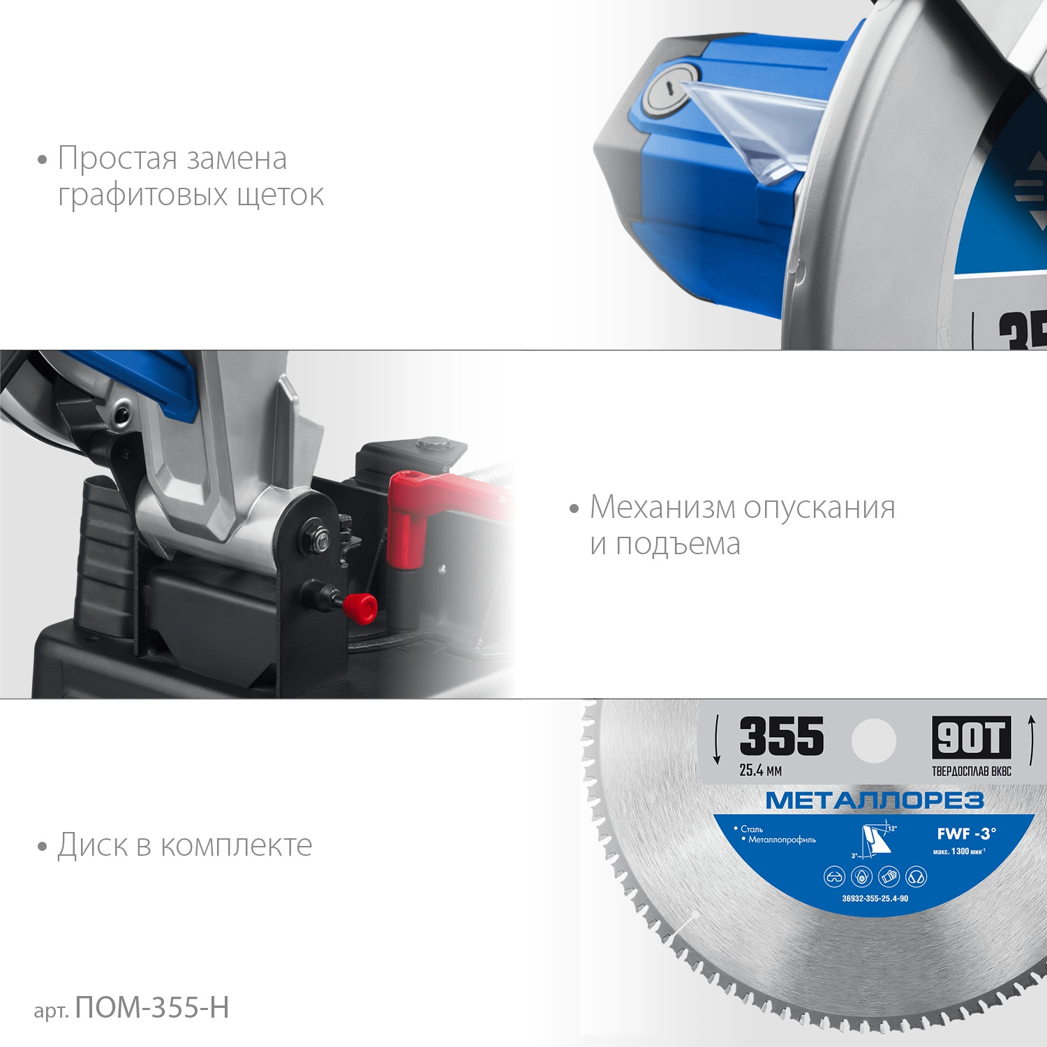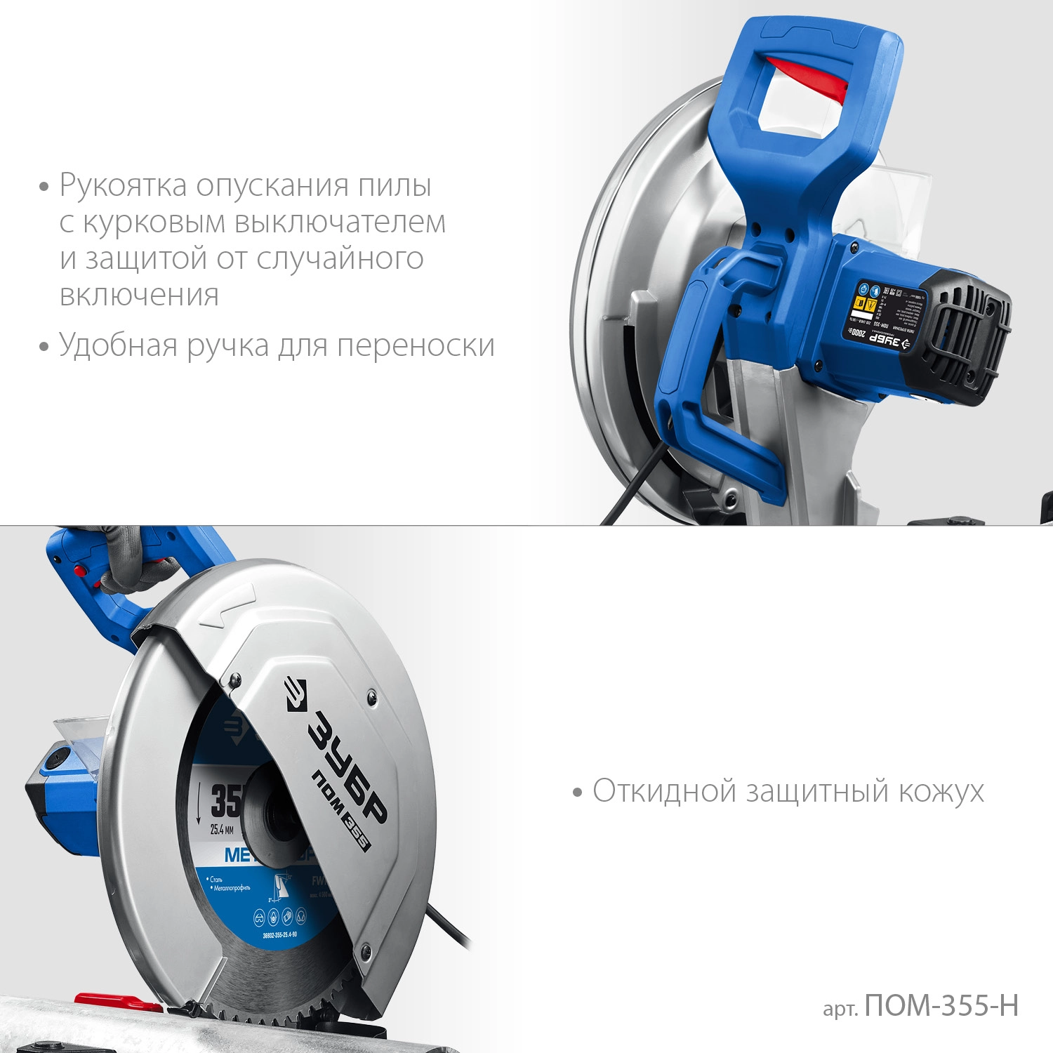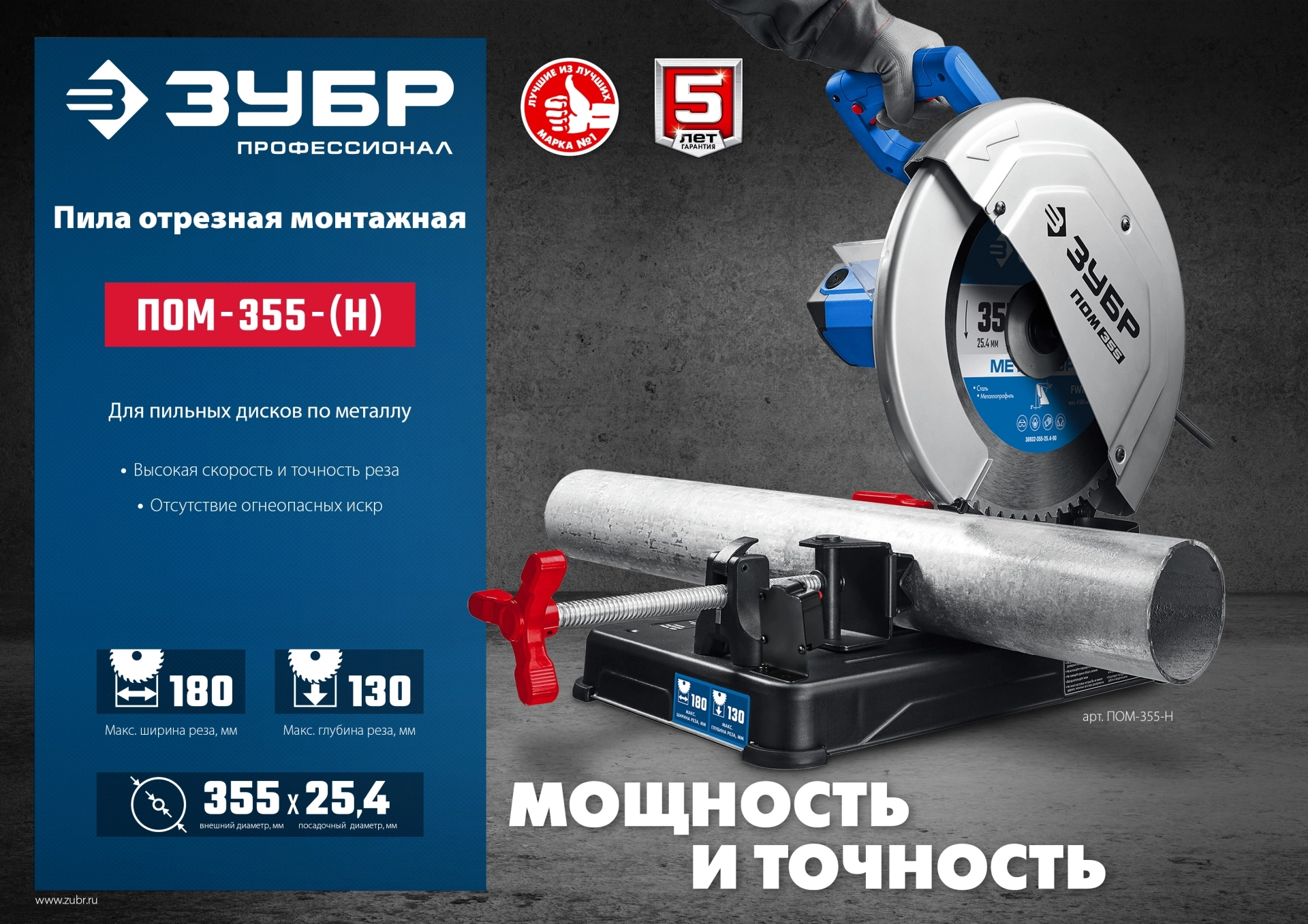 ПроизводителиПила отрезная по металлу ПОМ-355-Н с пильным диском (2000Вт, диск 355х25.4мм, рез 130мм, кор.) ЗУБР