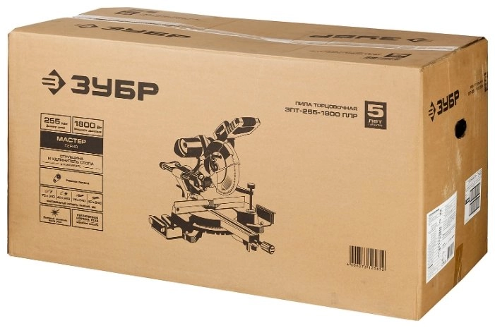 СТАНДАРТУровень качества. При классификации продуктов, имеющих схожее наименование, но обладающие различными потребительскими свойствами мы приняли следующий Вес факторов: 80% - подтвержденный ресурс, 15% - заявленная производительность/скорость, 5% - субъективные ощущения потребителя. ПодробнееКод товара: 0031732(0)Мощная и функциональная пила с лёгкостью распиливает древесину, пластик и тонкостенный алюминий (при установке соответствующих дисков). Подвижная голова позволяет разрезать габаритные заготовки шириной до 340 мм Пила ЗУБР - достойный выбор и отличный помощник в работеХарактеристикиАртикул ЗПТ-255-1800 ПЛРБренды ЗубрСтрана производства КитайТип торцовочнаяПотребляемая мощность 1800Цвет серый/черныйПосадочный диаметр 30Материал корпуса металлНапряжение 220Диаметр диска 255Кейс в комплекте нетРегулировка глубины реза ДаТормоз двигателя ДаВес 20Питание сетьСкорость вращения шпинделя 5000Количество пильных дисков 1Количество скоростей распила 1Ключ для смены диска ДаДлина 970Подключение к пылесосу естьМинимальная скорость вращения 4800Ширина 520Высота 540Глубина реза 90° 80Глубина реза 45° 40Лазерный маркер естьПылесборник естьСерия МастарШирина пропила 340Максимальная скорость вращения 4800Длина сетевого шнура 2Максимальная ширина пропила под углом 45° 230Максимальная ширина пропила под углом 90° 340Частота 50Описание товара обновлено 08.12.2025 13:57:02Мощная и функциональная пила с лёгкостью распиливает древесину, пластик и тонкостенный алюминий (при установке соответствующих дисков). Подвижная голова позволяет разрезать габаритные заготовки шириной до 340 мм