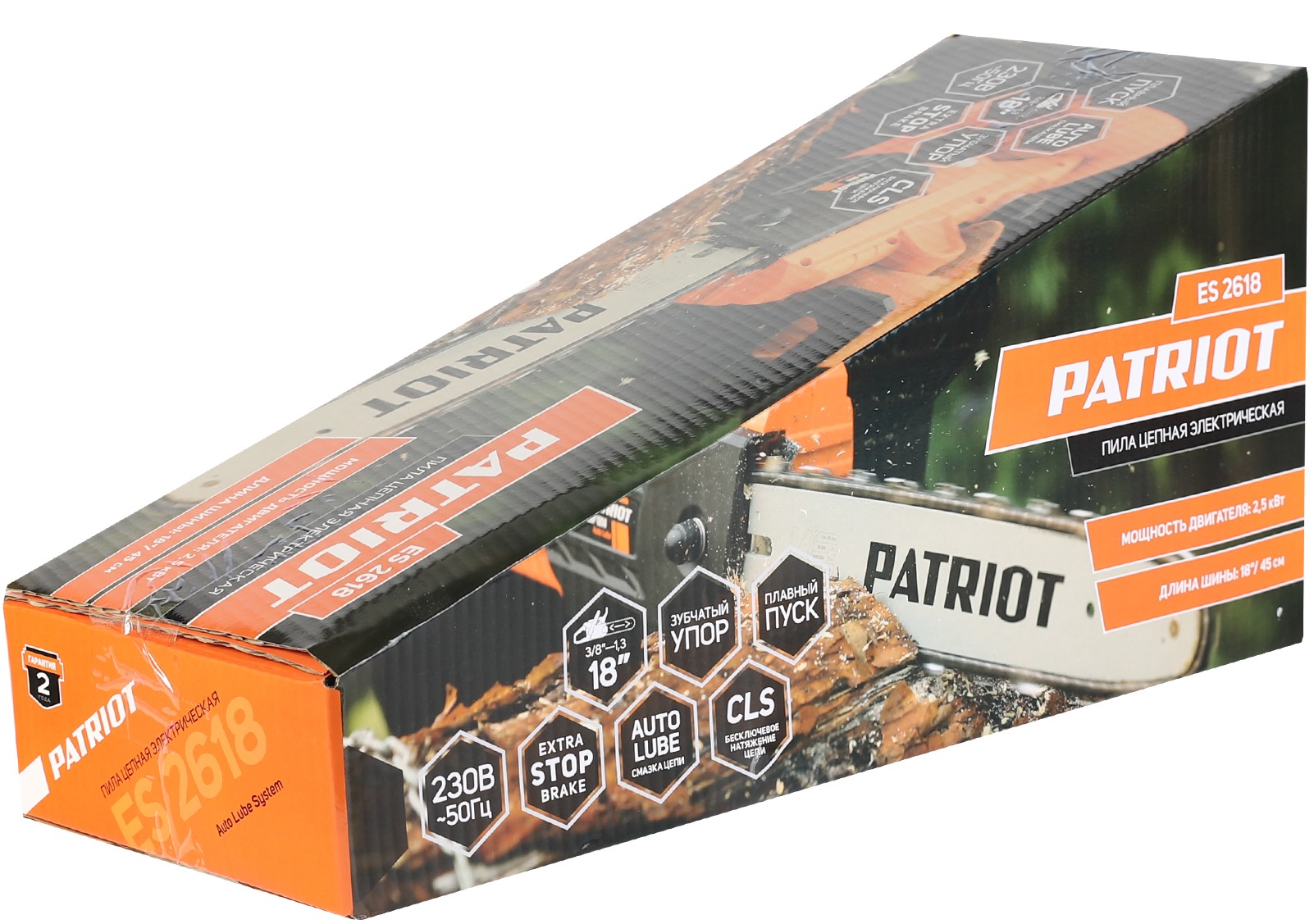 ПРОФИУровень качества. При классификации продуктов, имеющих схожее наименование, но обладающие различными потребительскими свойствами мы приняли следующий Вес факторов: 80% - подтвержденный ресурс, 15% - заявленная производительность/скорость, 5% - субъективные ощущения потребителя. ПодробнееКод товара: 0062704(0)ХарактеристикиАртикул 220301526Бренды PATRIOTСтрана производства КитайГарантия 24 месяцевТип электрическаяПотребляемая мощность 2500Длина цепи 45Число оборотов холостого хода 8800Ширина паза 1.3Назначение бытоваяМатериал корпуса пластикДвигатель/Тактность электрическийКоличество звеньев цепи 62Длина сетевого шнура 0.25Легкий пуск естьЗащита от перегрева естьРасположение двигателя продольноеАвтоматическая смазка цепи ДаТормоз цепи естьОбъем бака для смазки цепи 0.2Вес 6Напряжение сети 230Двигатель электрическийДлина шины 45Ширина паза 1.3Емкость масляного бака 0.2Шаг цепи 3/8Тормоз цепи естьАнтивибрация нетБыстрое натяжение цепи естьЛегкий пуск естьПодогрев рукояток нетПитание электропилы сетьДлина кабеля 0.25Обороты холостого хода 8800Количество звеньев цепи 62Уровень звуковой мощности (Lwa) 106Ширина в упаковке 53Высота в упаковке 26Глубина в упаковке 22Прорезиненная ручка ДаОписание товара обновлено 08.12.2025 14:39:53Преимущества Patriot ES 2618 Рычаг инерционного тормоза - экстренное торможение пильной цепи в случае её отскока Предусмотрена скоба крепления сетевого кабеля Техническое обслуживание почти не требуется, пильная цепь смазывается автоматически PATRIOT ES 2618 220301526 комплектуется чехлом для пильного аппарата - безопасность хранения и транспортировки Отсутствие выхлопов - возможность работать в помещении и на улице Плавный запуск двигателя без рывковПроизводитель: 11th Flooor,LiYuanShangdu Building A2,201# LanTian Road,NingBo China