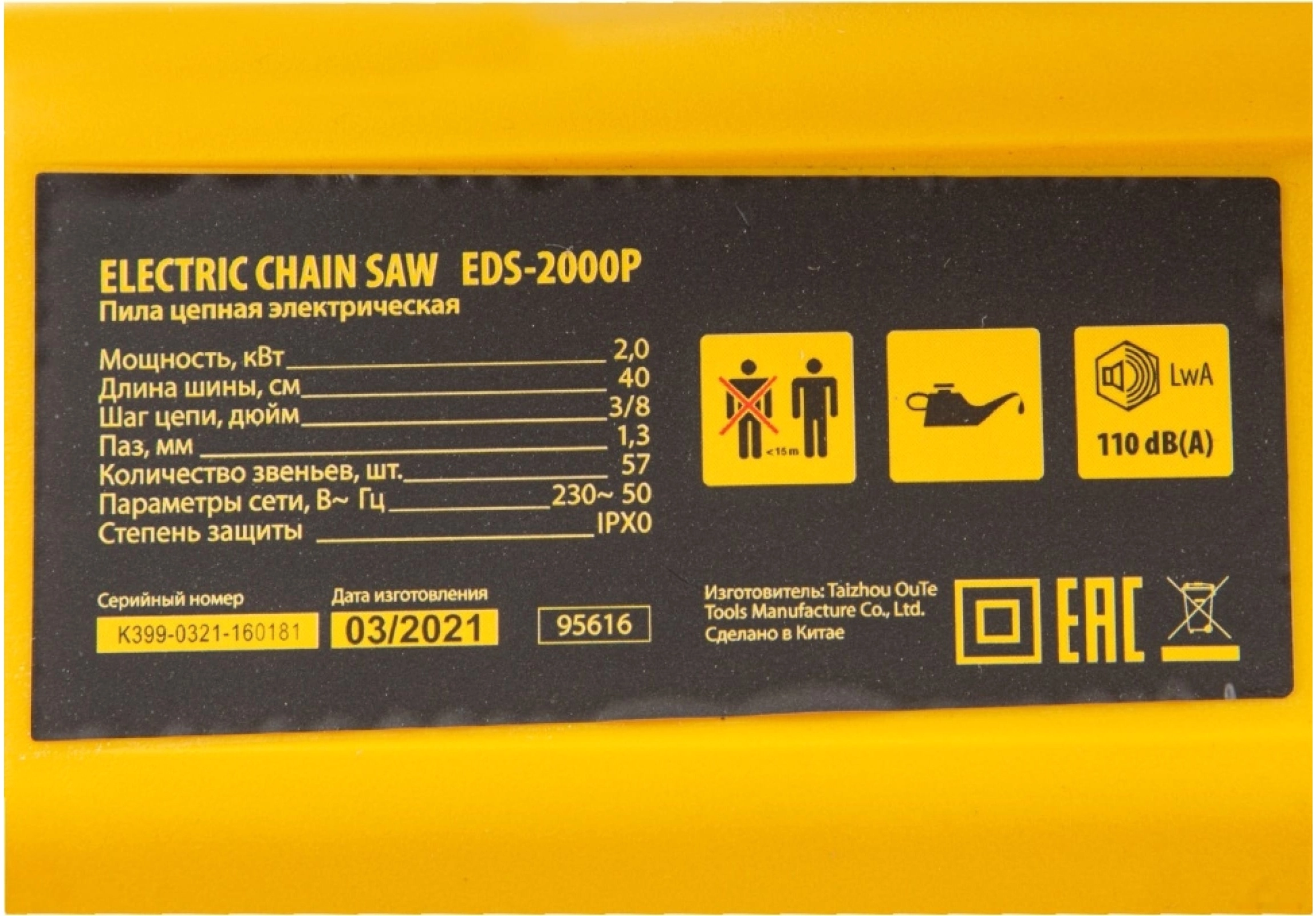 ПроизводителиПила цепная элект. EDS-2000P, 2кВт,поперечная,шина 40см,шаг 3/8, паз 1,3мм, 57зв Denzel