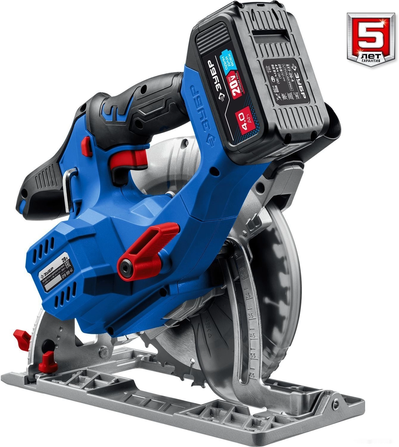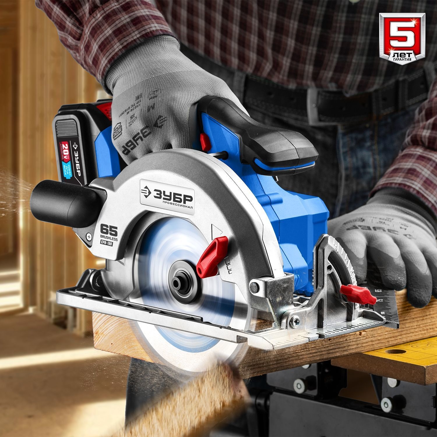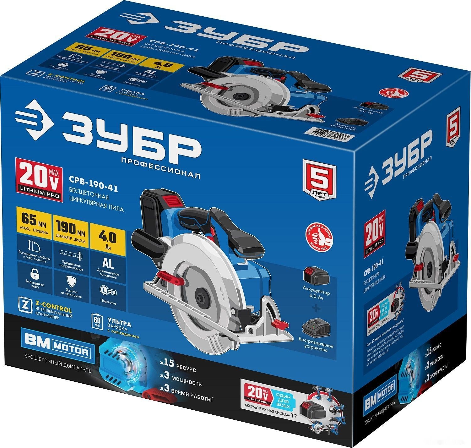 ХарактеристикиАртикул CPB-190-41Бренды ЗубрСтрана производства КитайАккумуляторная система ЗУБР Li-Ion PRO 20BТип дисковаяЧисло оборотов холостого хода 3500Напряжение аккумулятора 20Диаметр пильного диска, мм 190Диам. отверстия пильного диска, мм 20Посадочный диаметр 20Емкость аккумулятора 4Напряжение 20Диаметр диска 190Тип аккумулятора Li-ionКейс в комплекте нетВес 4Питание аккумуляторСкорость вращения шпинделя 3500Регулировка скорости распила нетКоличество скоростей распила 1Угол наклона диска 45Длина 420Подключение к пылесосу естьШирина 270Высота 225Глубина реза 90° 65Глубина реза 45° 45Плавный пуск естьЛазерный маркер нетПылесборник нетПодсветка естьBluetooth НетОписание товара обновлено 28.01.2026 16:57:02Аккумуляторная циркулярная пила ЗУБР CPB-190-41, предназначена для выполнения распиловочных работ по дереву и иным материалам (при установке диска d=190 мм) под различными углами, а также под наклоном. Высокая эффективность двигателя и увеличенный диаметр диска обеспечивают легкое пиление древесины любой породы на большие глубины. Прочное алюминиевое основание гарантирует жесткость конструкции и высокую точность реза. Всегда видимые индикаторы линии реза под углами 90 и 45 градусов помогают пилить точно по разметке. Бесступенчатая регулировка глубины и угла пиления с удобными шкалами - для точных работ. Эксцентриковый рычаг настройки глубины пиления в одно движение. Простая замена диска благодаря блокировке шпинделя. Аккумулятор и зарядное устройство входят в комплект.