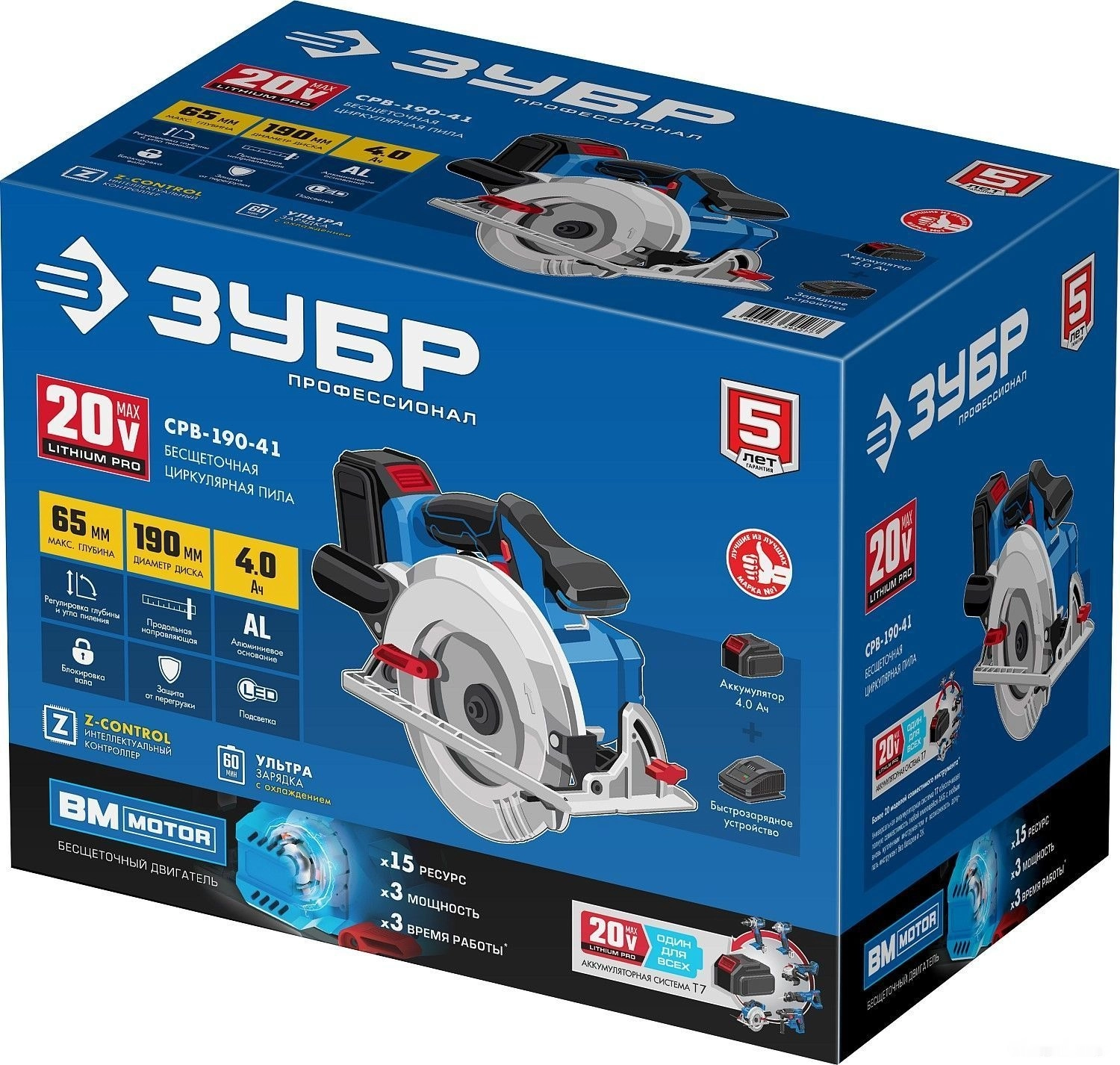 ПРОФИУровень качества. При классификации продуктов, имеющих схожее наименование, но обладающие различными потребительскими свойствами мы приняли следующий Вес факторов: 80% - подтвержденный ресурс, 15% - заявленная производительность/скорость, 5% - субъективные ощущения потребителя. ПодробнееКод товара: 0055453Изделие, сочетающее в себе преимущества разных типов инструментов - мощность и функциональность сетевого, независимость от питания и вес беспроводного. Удобство пиления, скорость и уровень автономности соответствуют профессиональному уровнюХарактеристикиАртикул CPB-190-41Бренды ЗубрСтрана производства КитайАккумуляторная система ЗУБР Li-Ion PRO 20BТип дисковаяЧисло оборотов холостого хода 3500Напряжение аккумулятора 20Диаметр пильного диска, мм 190Диам. отверстия пильного диска, мм 20Посадочный диаметр 20Емкость аккумулятора 4Напряжение 20Диаметр диска 190Тип аккумулятора Li-ionКейс в комплекте нетВес 4Питание аккумуляторСкорость вращения шпинделя 3500Регулировка скорости распила нетКоличество скоростей распила 1Угол наклона диска 45Длина 420Подключение к пылесосу естьШирина 270Высота 225Глубина реза 90° 65Глубина реза 45° 45Плавный пуск естьЛазерный маркер нетПылесборник нетПодсветка естьBluetooth НетОписание товара обновлено 08.12.2025 13:32:34Аккумуляторная циркулярная пила ЗУБР CPB-190-41, предназначена для выполнения распиловочных работ по дереву и иным материалам (при установке диска d=190 мм) под различными углами, а также под наклоном. Высокая эффективность двигателя и увеличенный диаметр диска обеспечивают легкое пиление древесины любой породы на большие глубины. Прочное алюминиевое основание гарантирует жесткость конструкции и высокую точность реза. Всегда видимые индикаторы линии реза под углами 90 и 45 градусов помогают пилить точно по разметке. Бесступенчатая регулировка глубины и угла пиления с удобными шкалами - для точных работ. Эксцентриковый рычаг настройки глубины пиления в одно движение. Простая замена диска благодаря блокировке шпинделя. Аккумулятор и зарядное устройство входят в комплект.