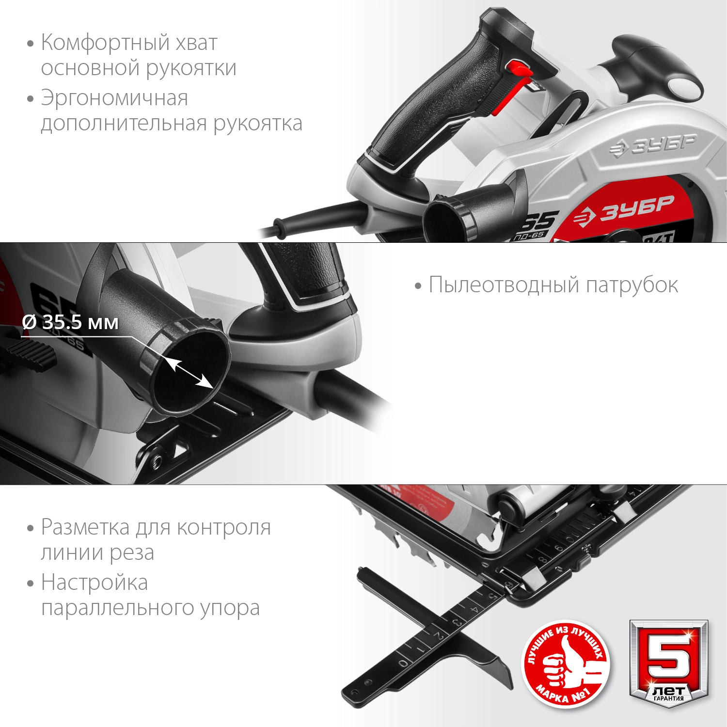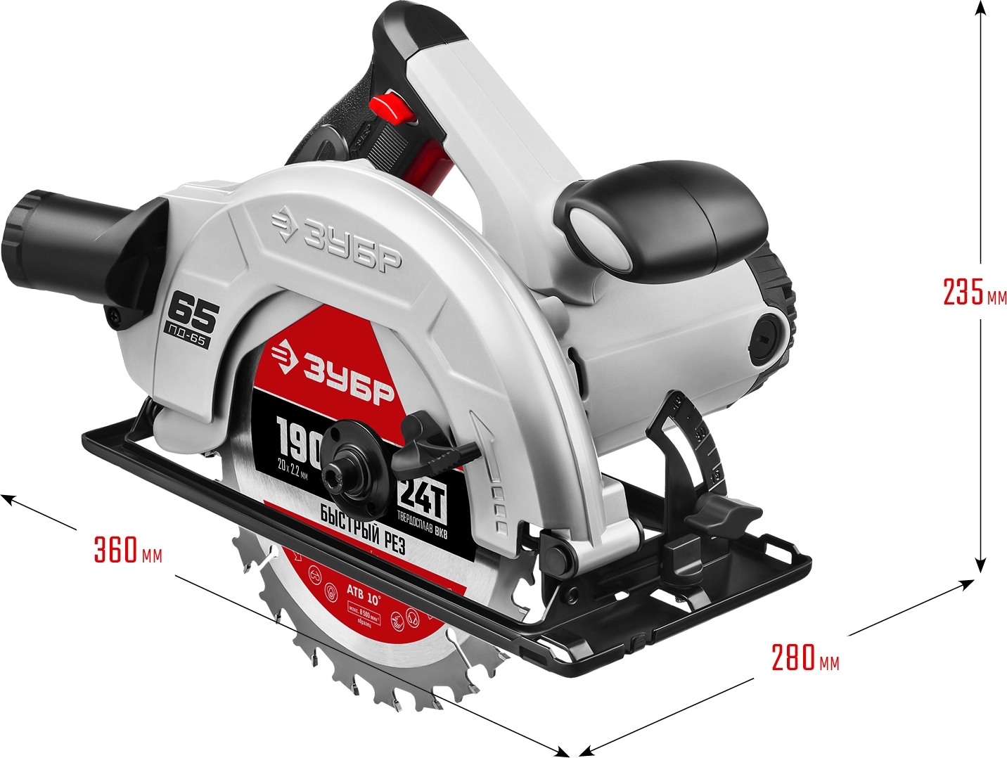 СТАНДАРТУровень качества. При классификации продуктов, имеющих схожее наименование, но обладающие различными потребительскими свойствами мы приняли следующий Вес факторов: 80% - подтвержденный ресурс, 15% - заявленная производительность/скорость, 5% - субъективные ощущения потребителя. ПодробнееКод товара: 0044294(6)ХарактеристикиАртикул ПД-65Бренды ЗубрСтрана производства КитайТип дисковаяПотребляемая мощность 1600Количество скоростей 1Число оборотов холостого хода #REF!Скорость вращения 4700Макс. диаметр диска, мм 190Диаметр диска 190Тип двигателя электрическийДлина сетевого шнура 2Кейс в комплекте нетДиаметр посадочного места 20Вес 4.2Конструкция ручнаяВысота пропила 65Мощность (Вт) 1600Уровень шума 104Скорость вращения при номинальной нагрузке 4700Ширина 280Высота 235Плавная регулировка скорости НетЧисло ходов в минуту 4700Работа от аккумулятора НетЭлектронная защита двигателя НетПодсветка НетУгол наклона 45Лазерный маркер НетПылесборник НетТорможение двигателя НетВозможность подключения пылесоса ДаАнтивибрация НетПрименение бытовоеГлубина 360Плавный пуск НетГлубина резания (90°) 65Глубина резания (45°) 42Материал рукоятки пластикМатериал рабочей части стальОписание товара обновлено 08.12.2025 13:45:36Пила дисковая ЗУБР ПД-65, предназначена для распиловочных работ по дереву и иным материалам (при установке соответствующего диска) под различными углами, а также под наклоном. Имеет небольшой вес, очень компактный с увеличенной мощностью. Двигатель с запасом мощности и редуктор с увеличенным передаточным числом обеспечивают большую производительность и надежность. Диск с твердосплавными напайками и оптимальным количеством зубьев для производительного пиления. Основная и дополнительная рукоятки с мягкими накладками и естественной эргономикой. Усовершенствованная конструкция и точность пиления, современный дизайн и удобство в работе, улучшенные параметры и безопасность оператора являются основой качественного и легкого пиления.