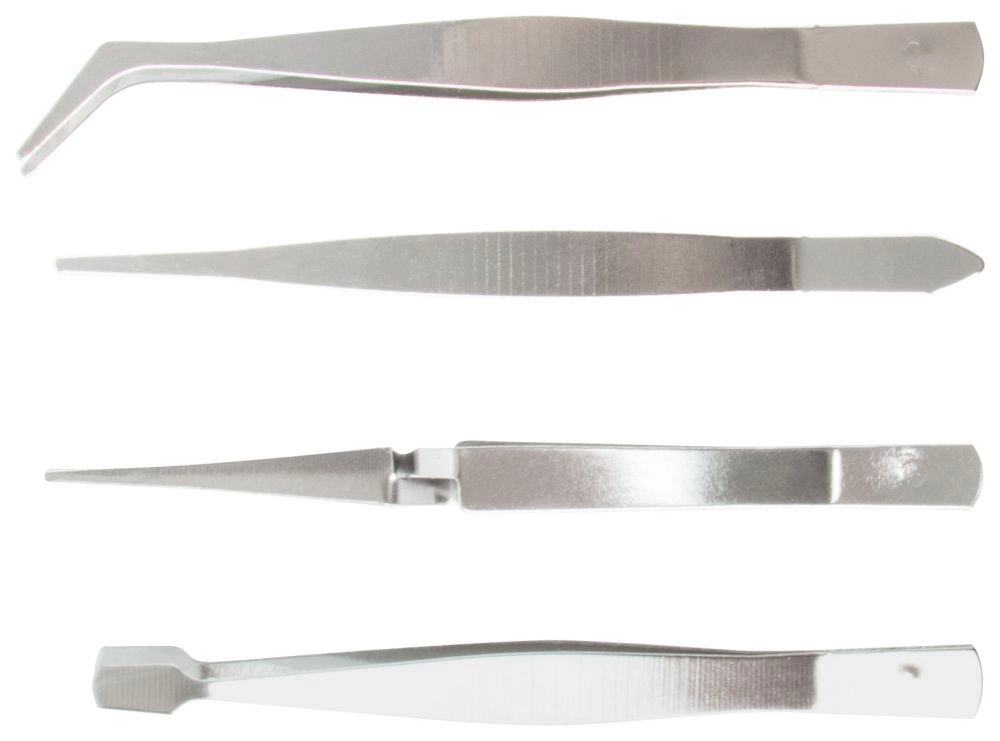Набор. "Пинцет прямой". *Пинцет с захватом под углом 45 град . *Пинцет с изогнутым широким захватом. * Пинцет обратного действия. Материал: инструментальная сталь. Упаковка: блистер .Производитель: