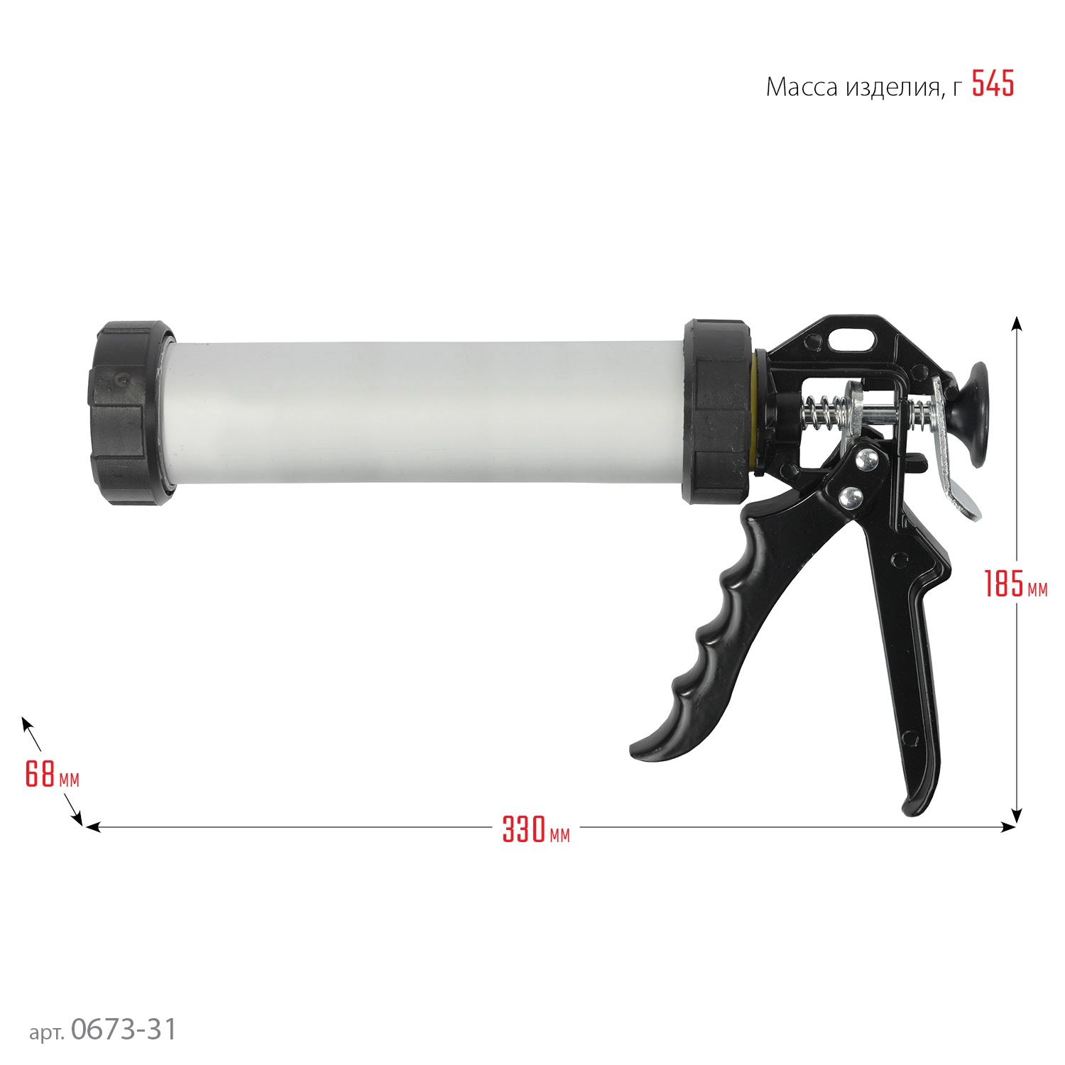 ХарактеристикиАртикул 0673-31Бренды StayerСтрана производства КитайТип изделия Пистолет для герметикаОбъем, мл 310Вес 0.545Пистолет для герметиков KRAFTOOL подходит для работы с герметиками в алюминиевой фольге и пластиковых картриджах объемом до 310 мл, эргономичная форма рукоятки создает комфортные условия работы, Изготовлен из особопрочных материалов.