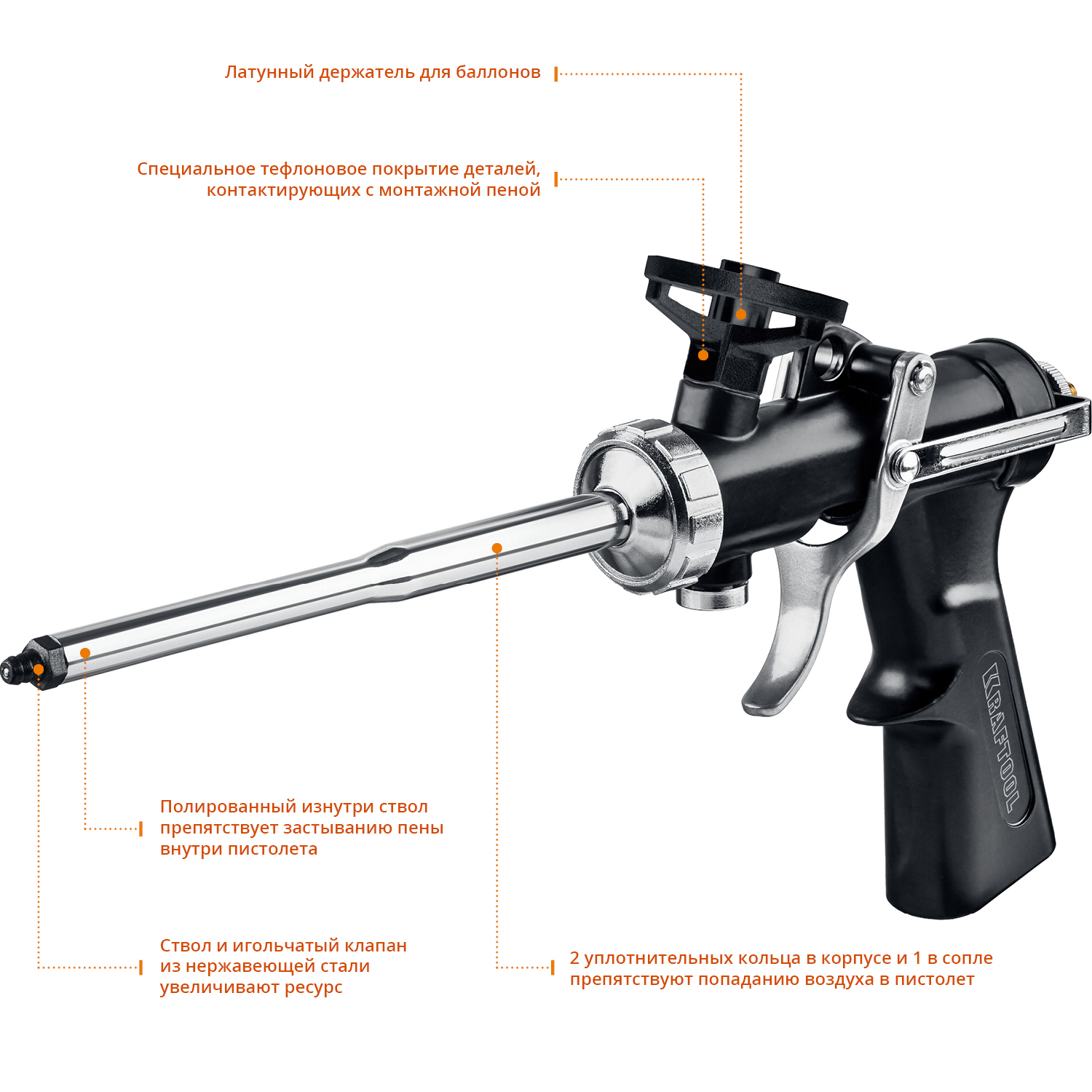 •Ствол и игольчатый клапан из нержавеющей стали увеличивают ресурс инструмента. Полированный изнутри ствол препятствует застыванию пены внутри пистолета