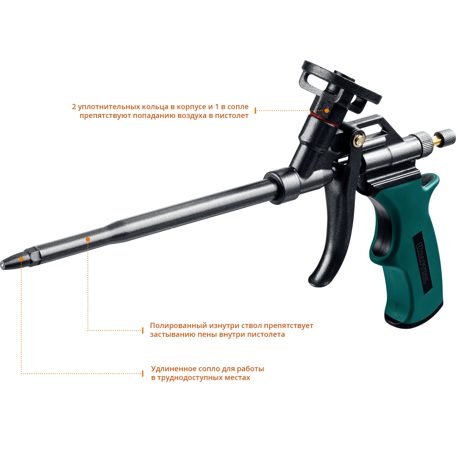 •Инновационная конструкция с двумя уплотнительными кольцами в корпусе и кольцом в сопле обеспечивает наилучшую герметичность, предотвращая попадание воздуха в пистолет, что минимизирует риск затвердевания пены внутри корпуса