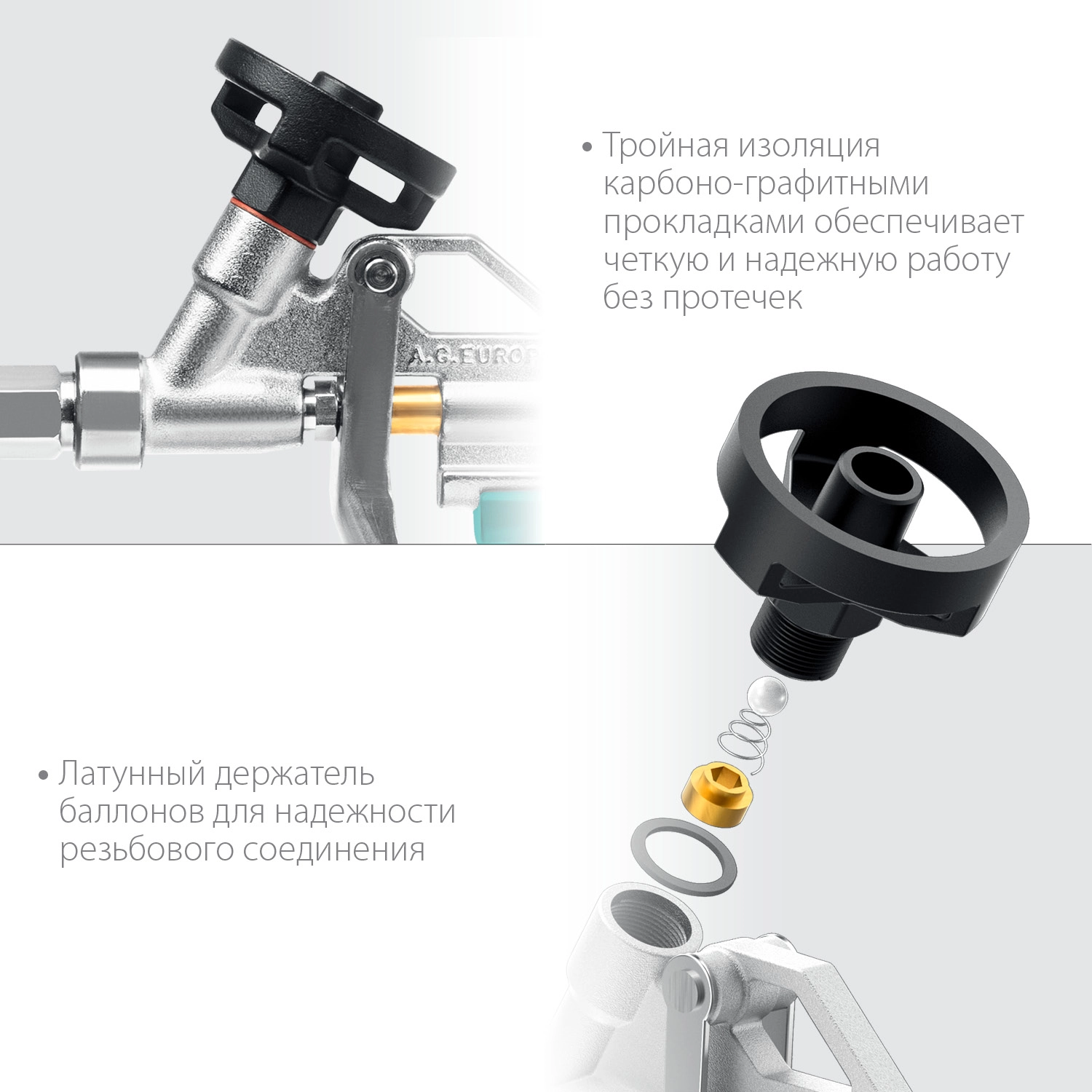 - Регулятор подачи пены имеет лёгкий и точный ход, а также предотвращает вращение игольчатого клапана, приводящее к быстрому износу прокладок.