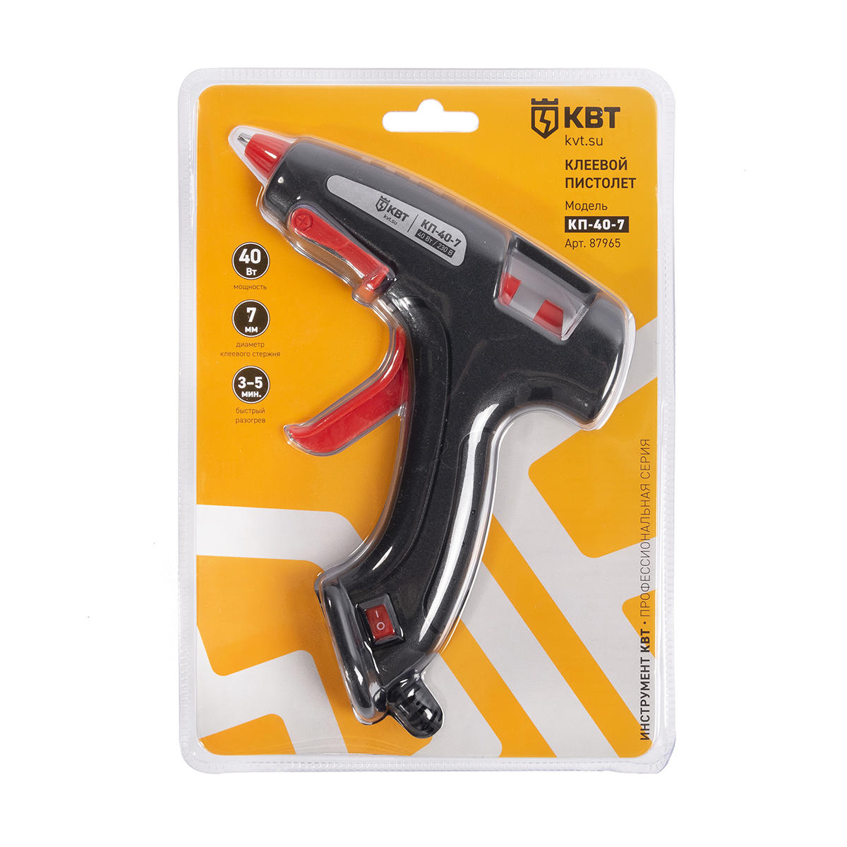 ПроизводителиПистолет клеевой 40 Вт с диаметром стержня 7 мм КП-40-7 серия ПРОФИ (87965) КВТ