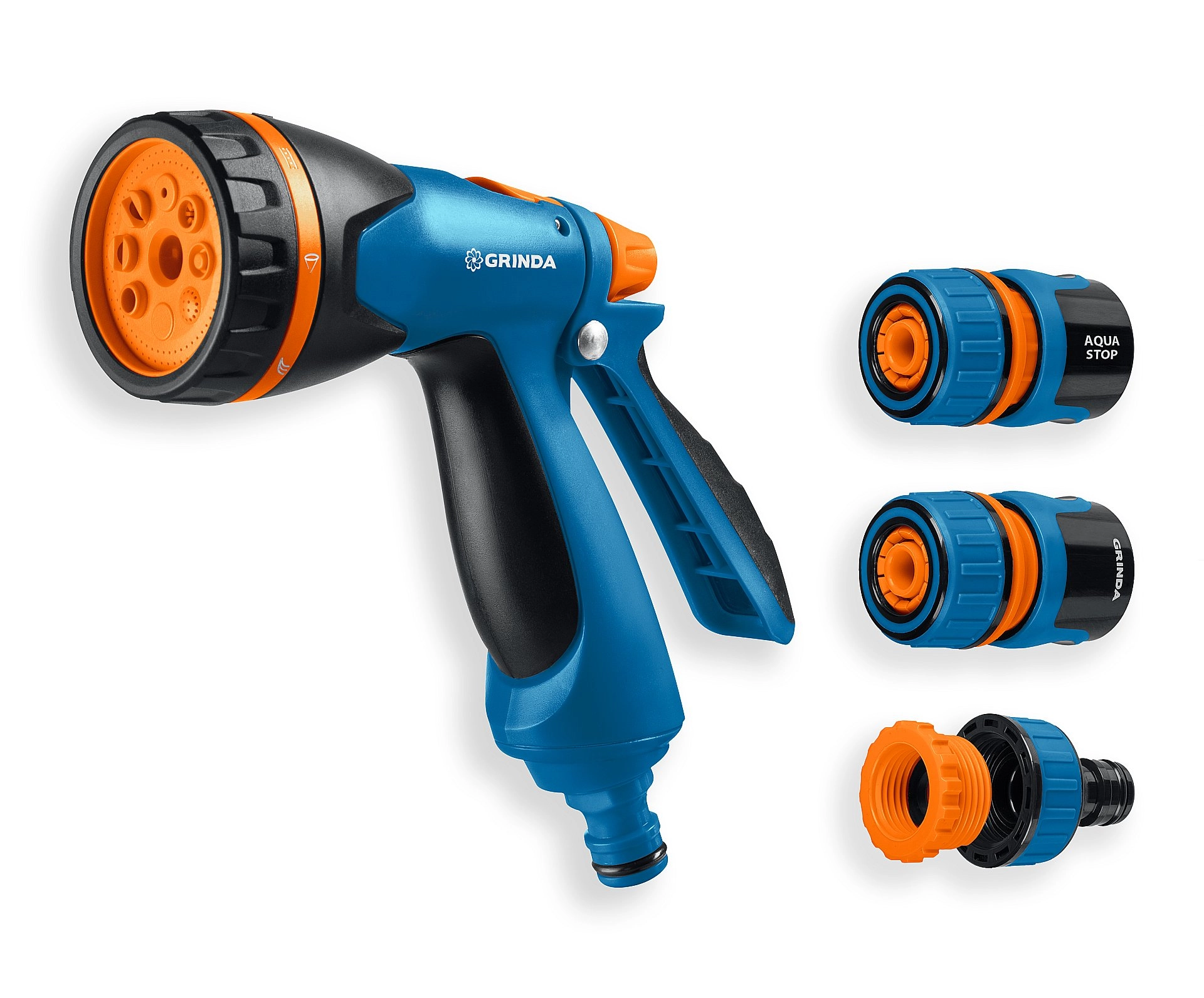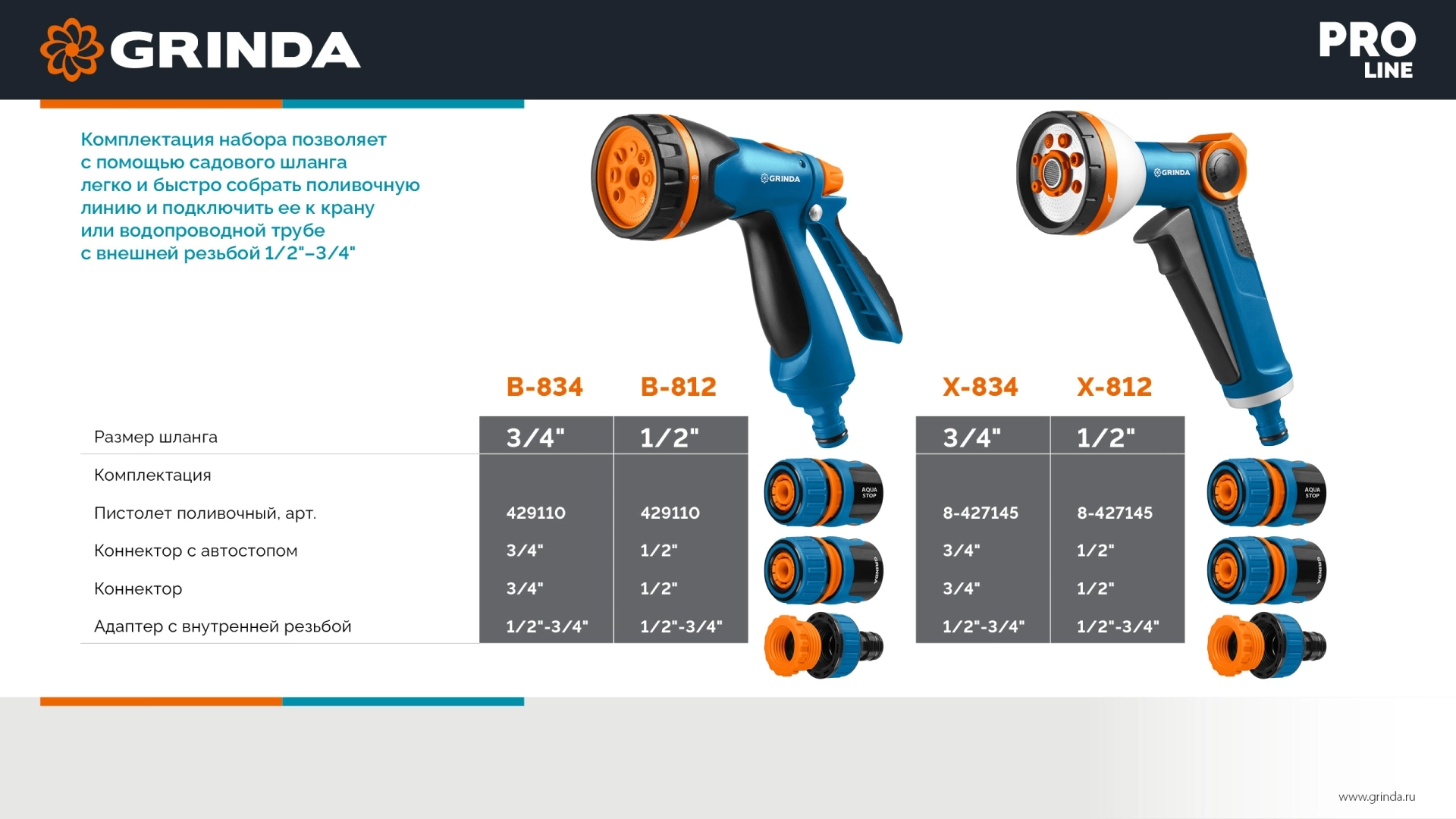 ПроизводителиПистолет полив B-8, коннектор 1/2,конектор 1/2 с автостоп,адаптер с внутр. рез,B-812 (429114) GRINDA