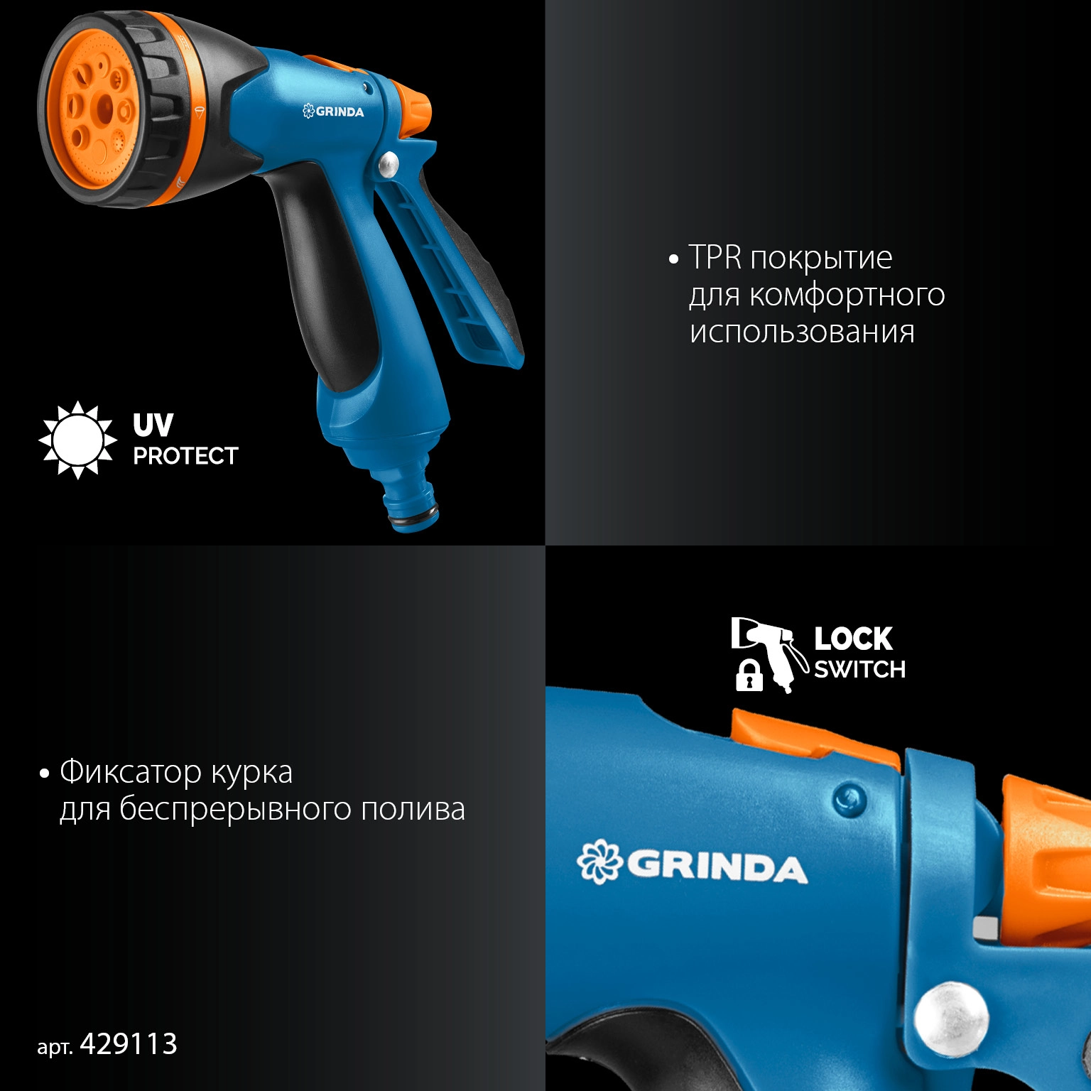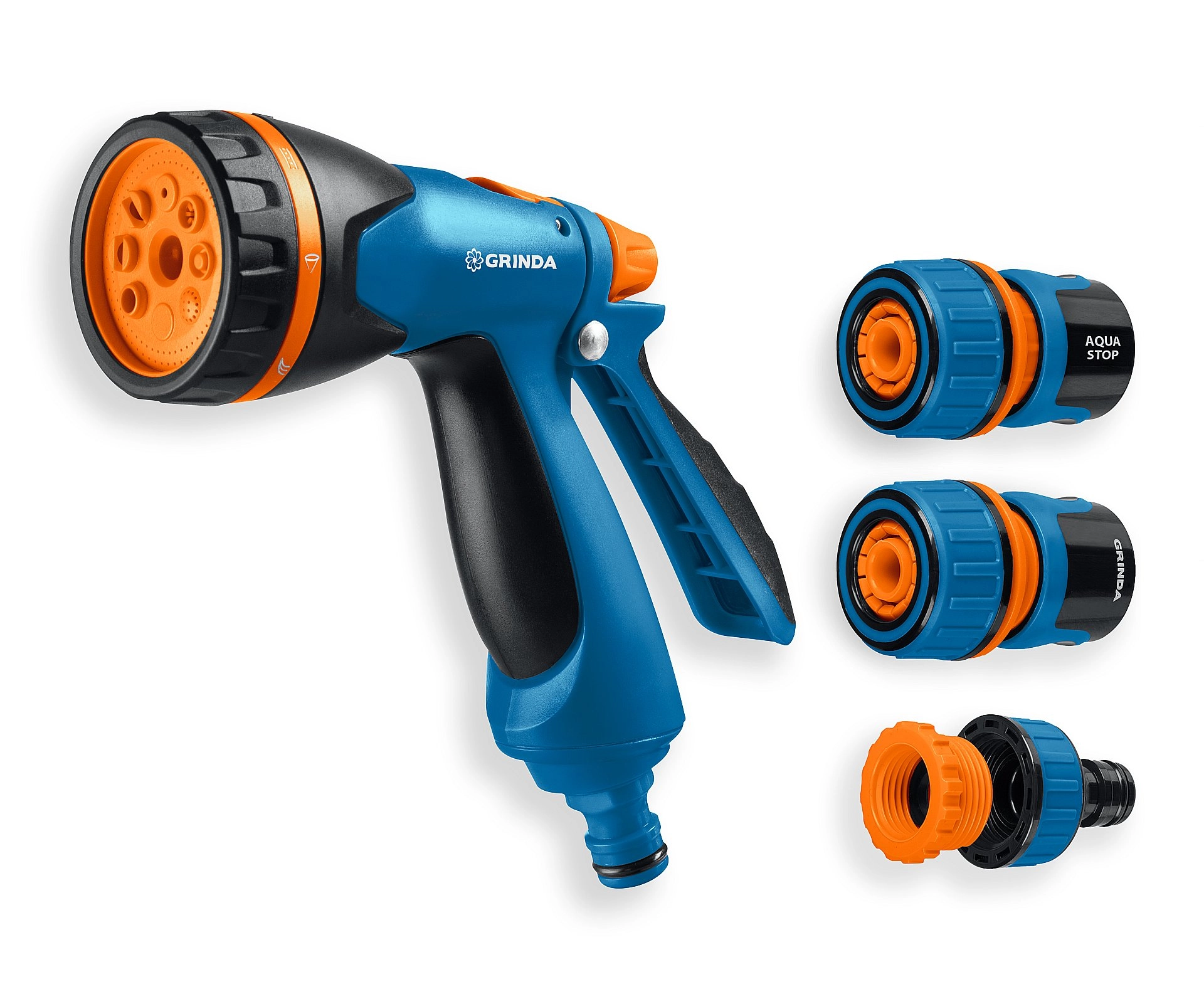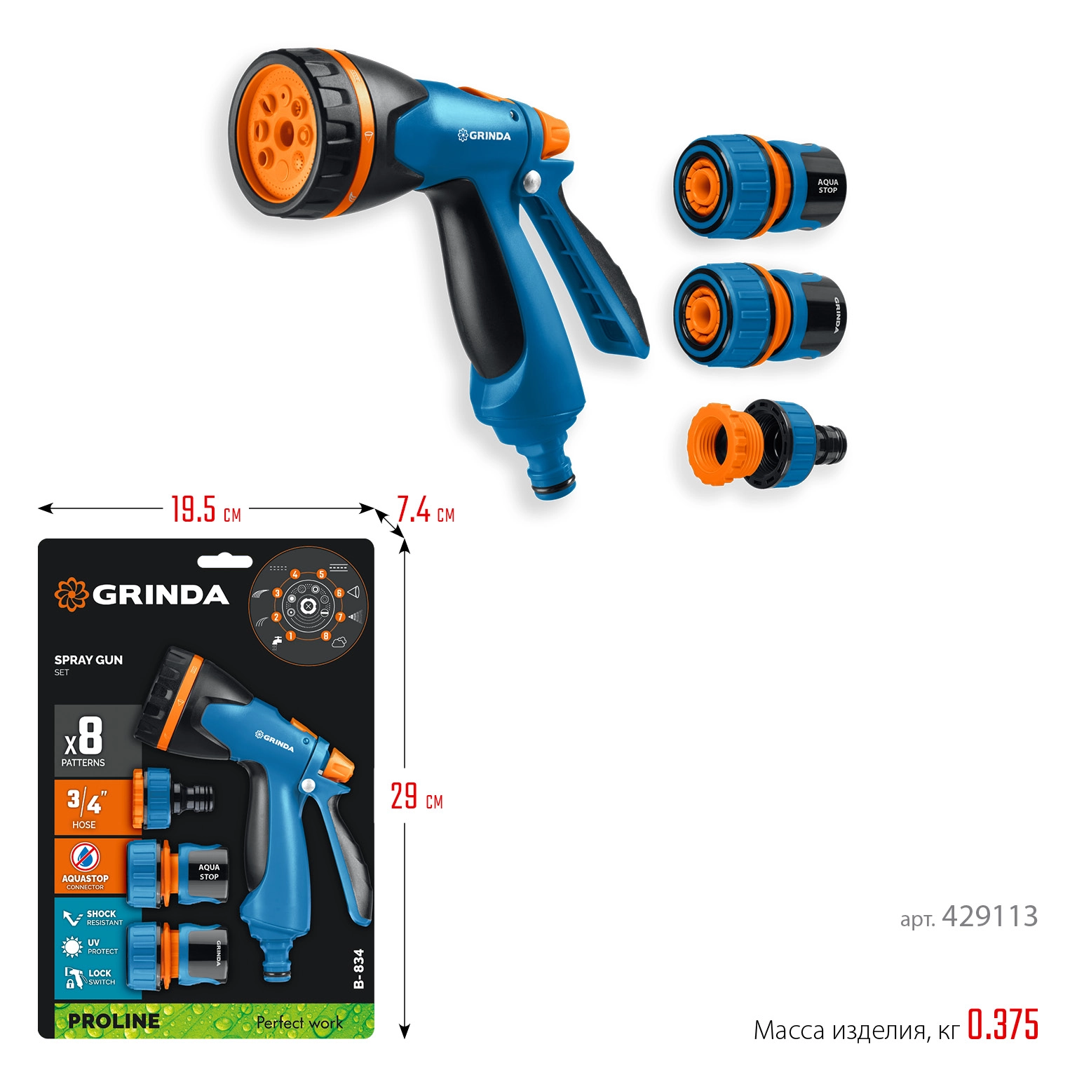 ПроизводителиПистолет полив B-8, коннектор 3/4,конектор 3/4 с автостоп, адаптер с внутр.рез,B-834 (429113) GRINDA