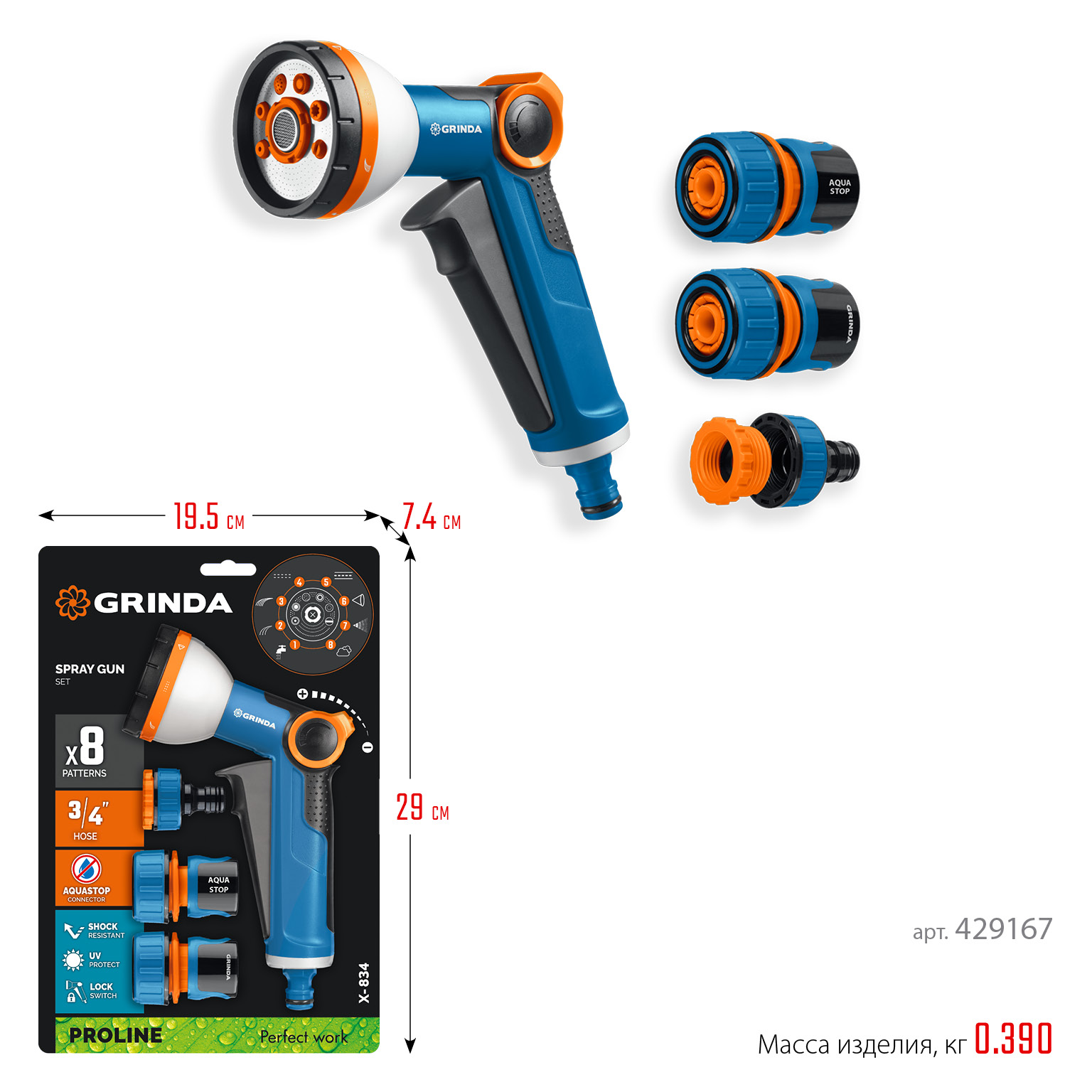 ПроизводителиПистолет полив Х-8, коннектор 3/4,конектор 3/4 с автостоп, адаптер с внутр.рез,Х-834(429167) GRINDA