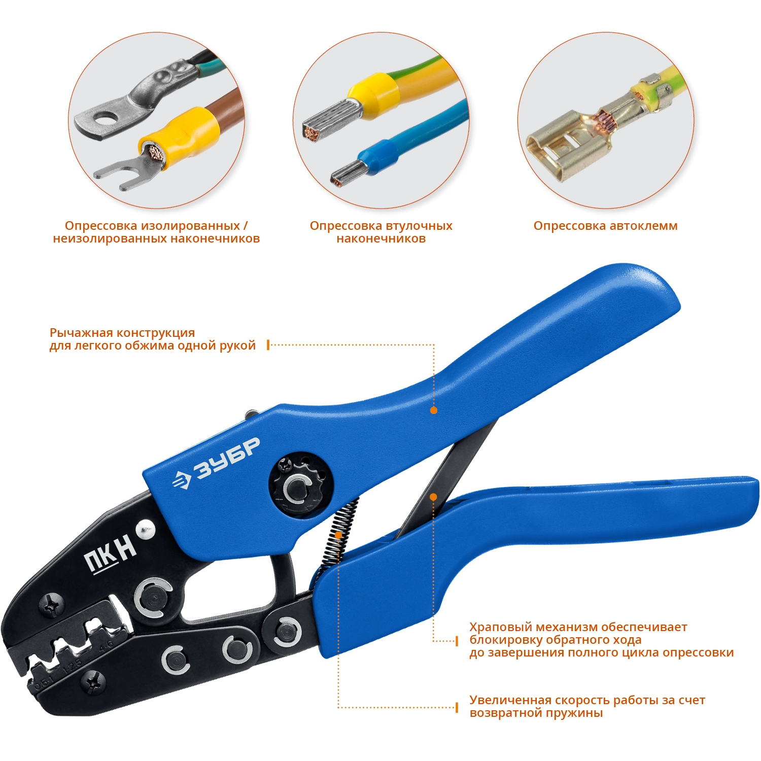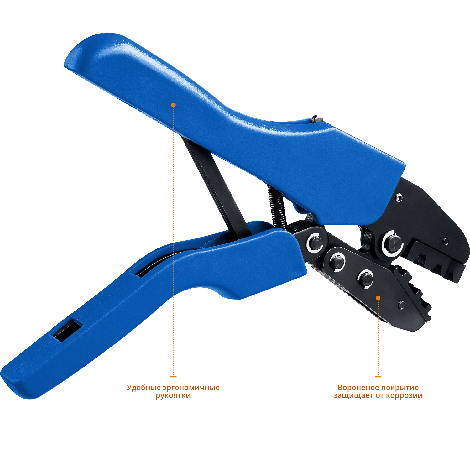 - Рычажная конструкция обеспечивает удобство в процессе обжима наконечников