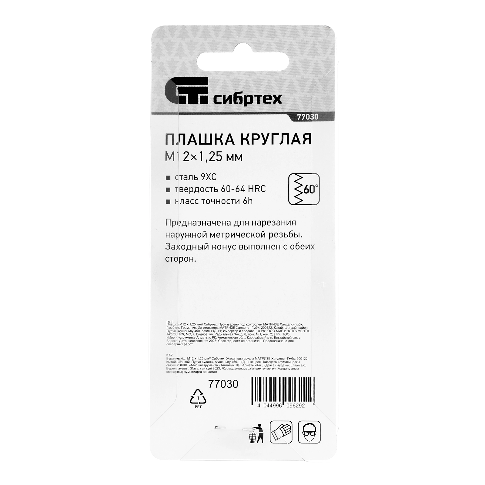ПроизводителиПлашка метрическая М12 х 1,25 мм (77030) СИБРТЕХ