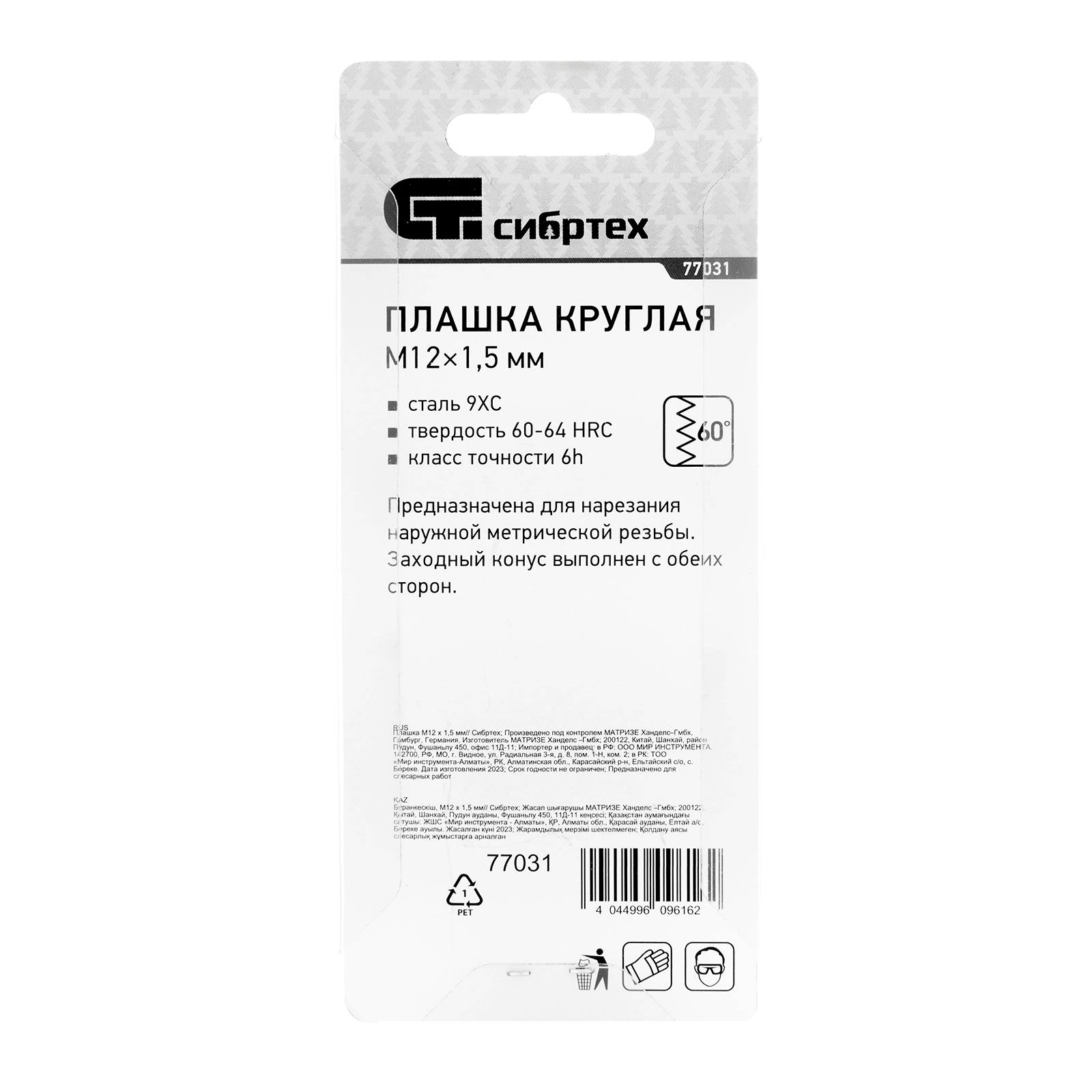 ПроизводителиПлашка метрическая М12 х 1,5 мм (77031) СИБРТЕХ