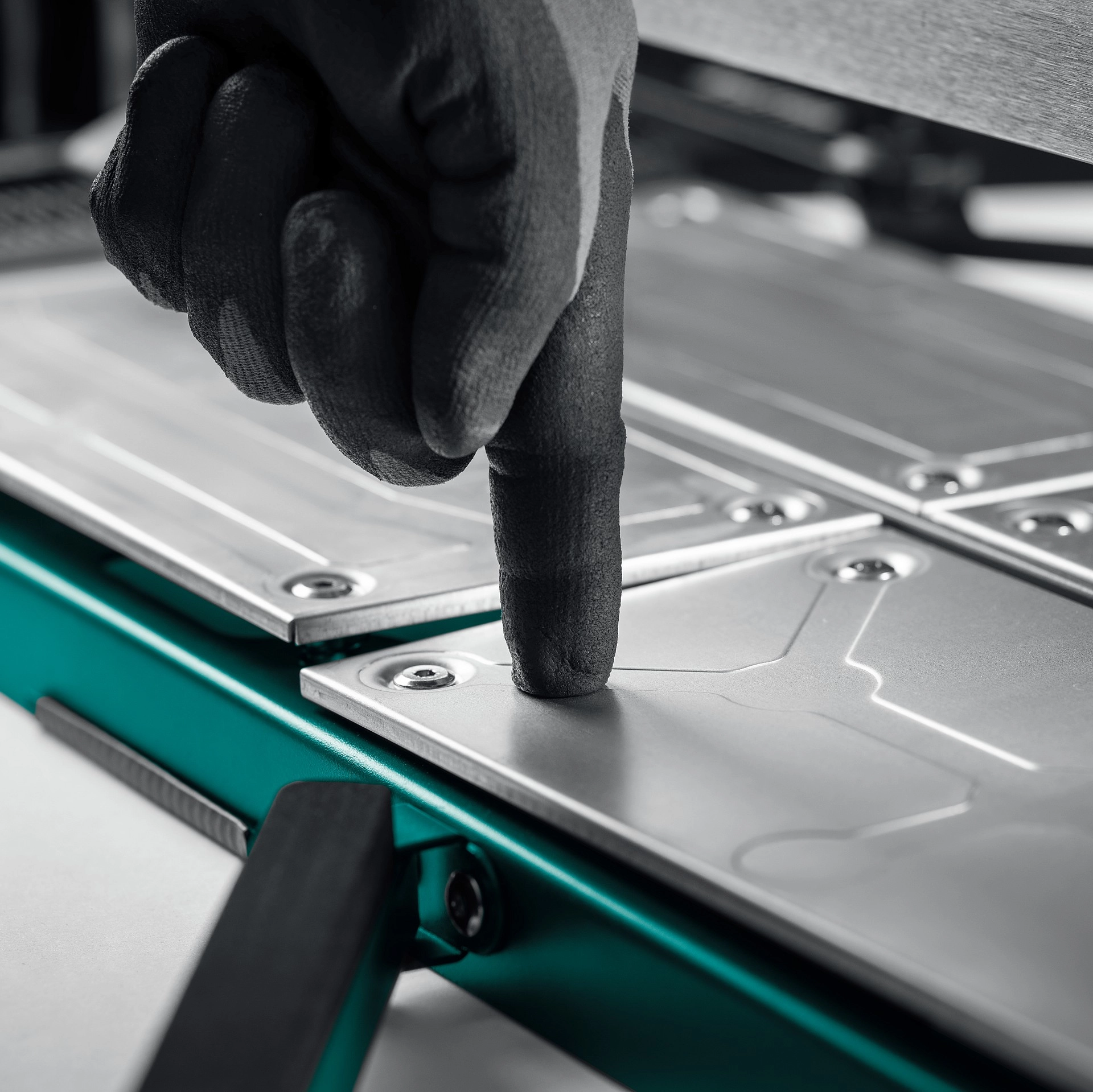 Его режущий элемент рассчитан на 5 километров реза без замены. Плавный ход каретке обеспечивают 10 подшипников, спрятанных в корпусе. Цельный стальной рельс прямоугольного сечения позволяет каретке надежно перемещаться, не застревая даже при самых сильных нагрузках.