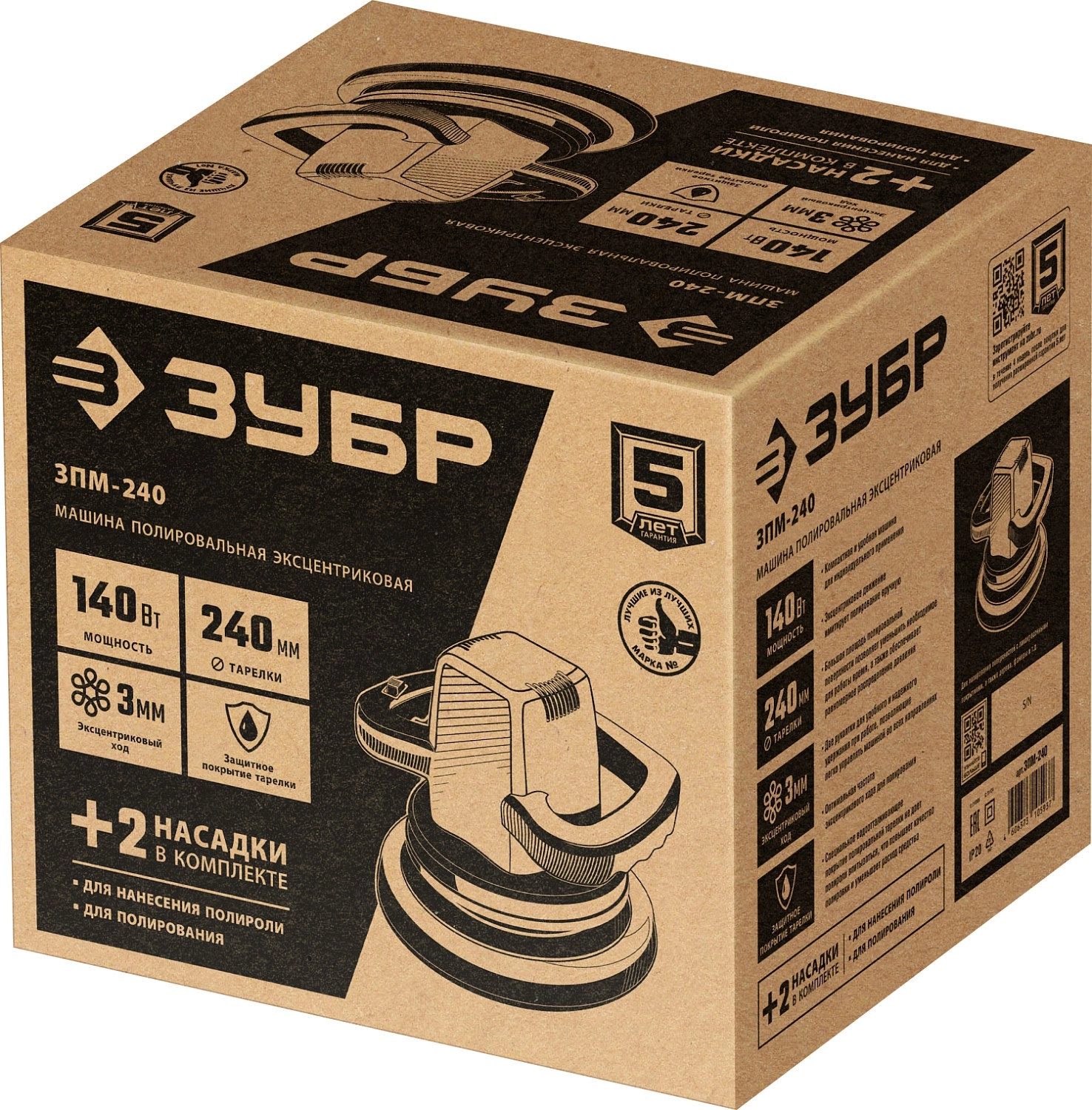 ПроизводителиМашина полировальная ЗПМ-240 (140Вт, диск 240мм, 2 полировальные насадки, 3200 об/мин, кор.) ЗУБР
