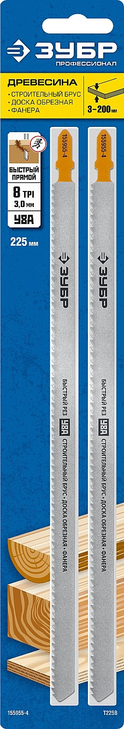 ПроизводителиПилка лобзиковая T 225 B, HCS, по дереву, строит. брус, шаг 3мм, 250/225мм, 2шт. (155955-4) ЗУБР
