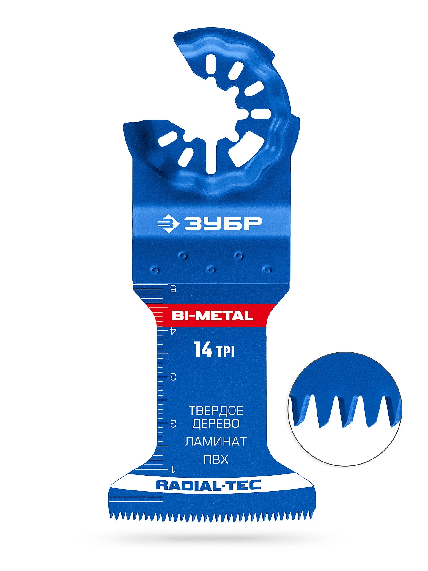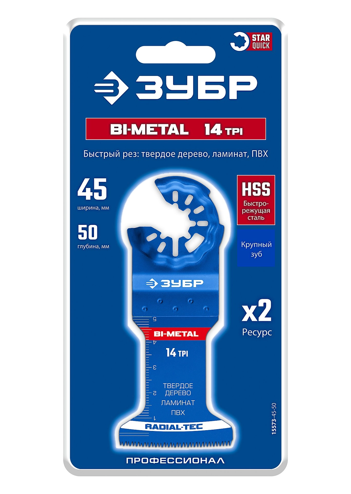ПроизводителиПолотно биметал, 45x50мм, 14TPI,быстрый рез: твердое дерево, ламинат, ПВХ, BIM (15573-45-50) ЗУБР