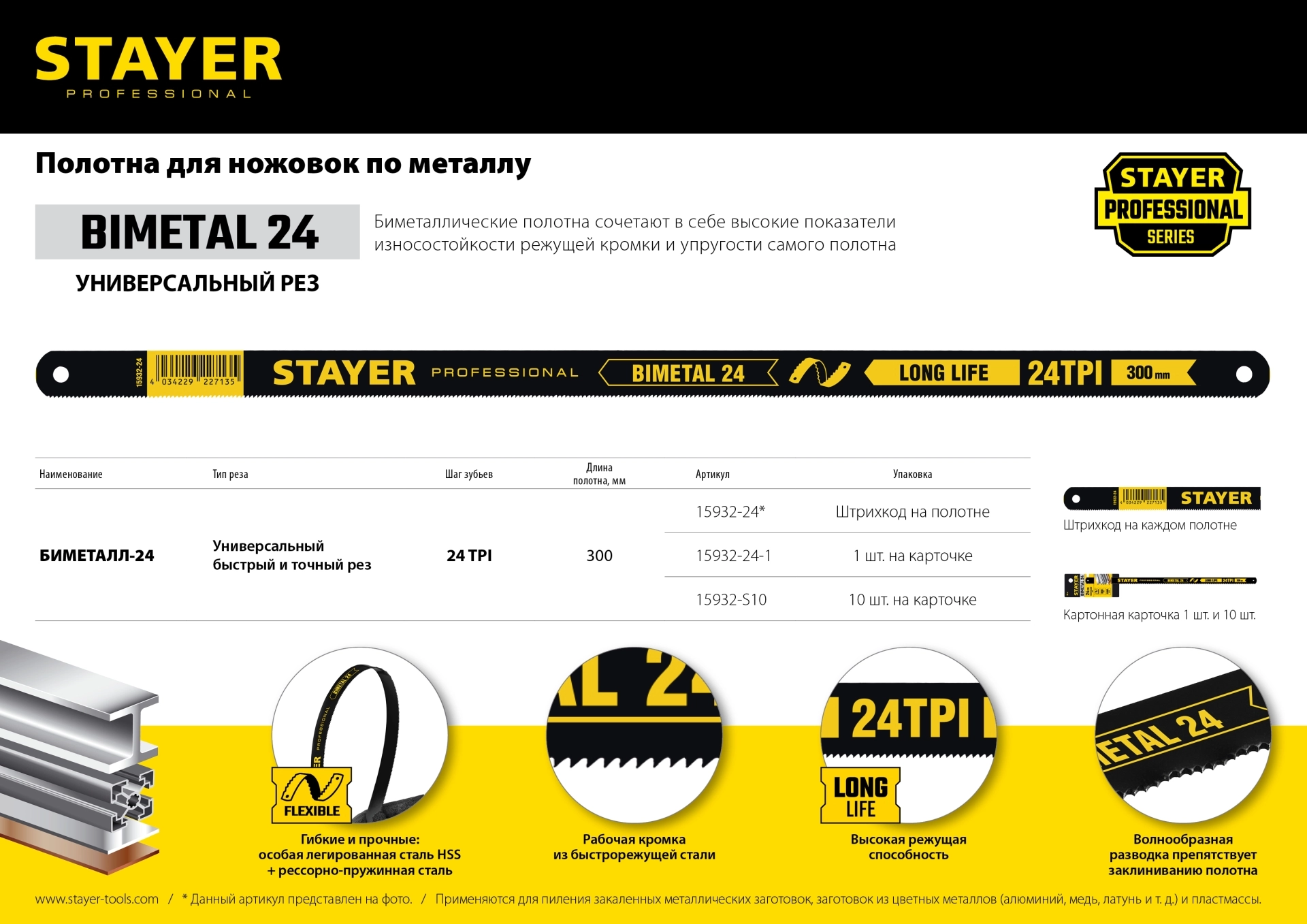ПроизводителиПолотно "PROFI" "-FLEX" по металлу, биметаллическое, 24TPI, 300 мм, 10 шт (15932-S10) STAYER