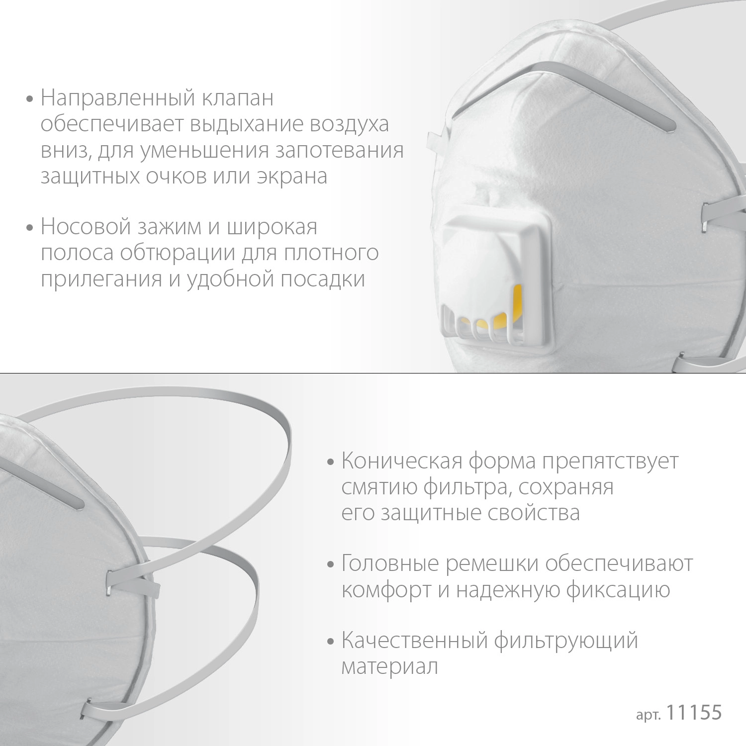 ПроизводителиПолумаска фильтрующ,коническая, с направленным клапаном выдоха,класс защиты FFP1,ФКН-80(11155) ЗУБР