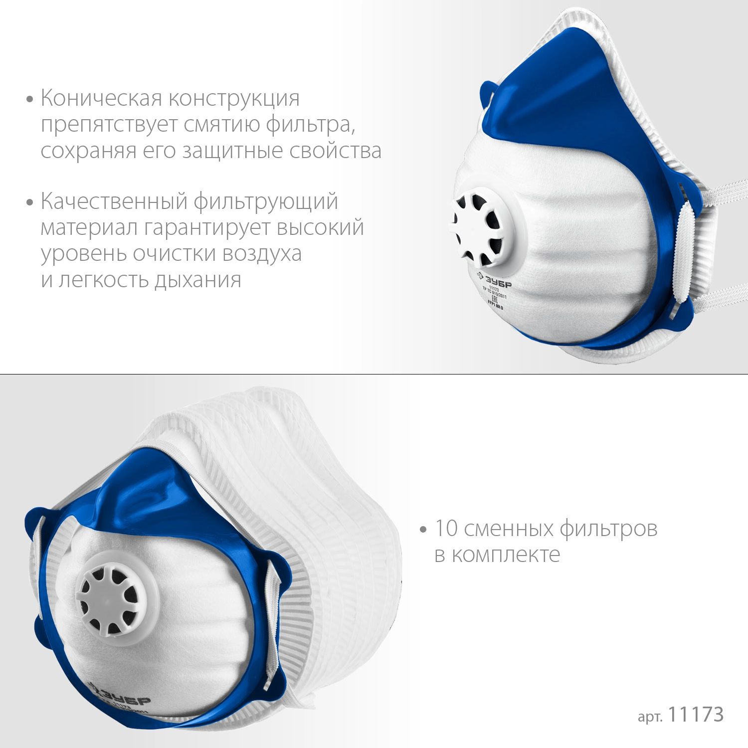 ПроизводителиПолумаска фильтрующая, коническая, класс защиты FFP1,пластик каркас,10 смен фильтр (11173) ЗУБР