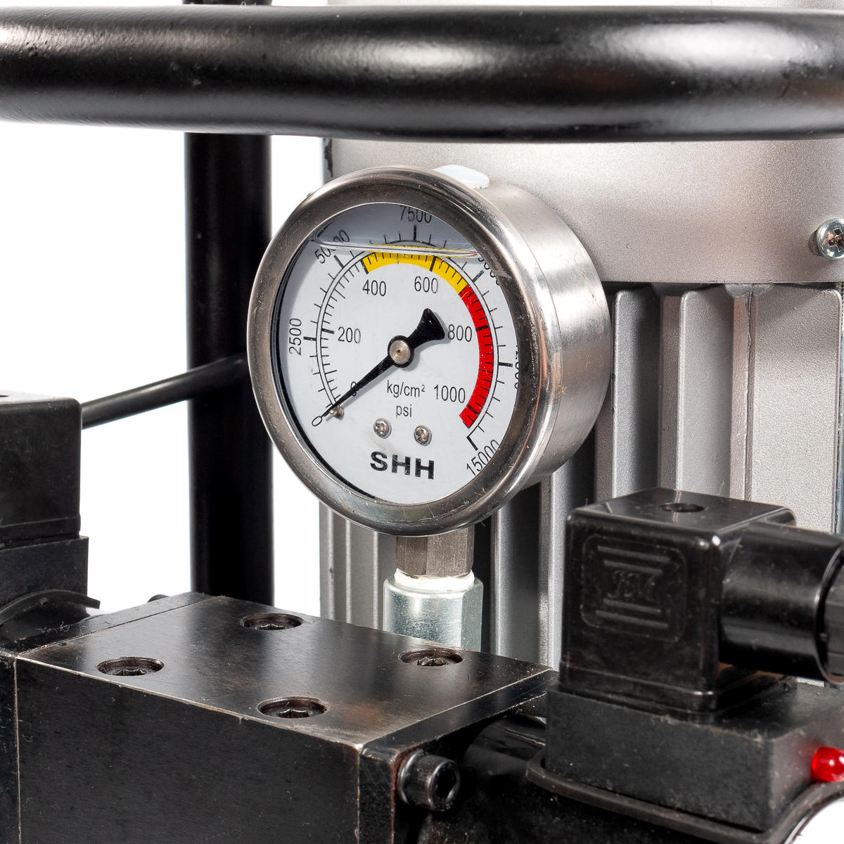 Объем маслобака: 5 л Максимальное давление: 700 бар (70 МПа) Механизм автоматического сброса давления (АСД) В стенку маслобака встроен термометр и индикатор уровня маcла в помпе Мощность электродвигателя 0.75 кВт Напряжение: 230 В/50 Гц Вес инструмента с полным маслобаком: 31.60 кг Габариты упаковки: 465х350х520 мм Характеристики