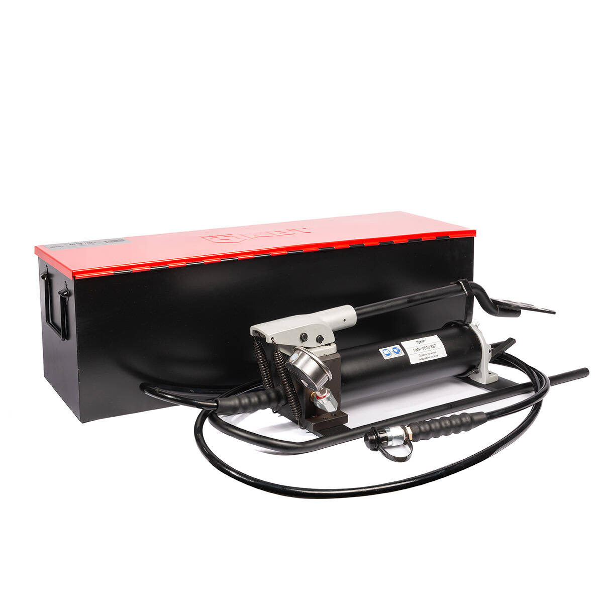 В комплекте: гидравлическая помпа ПМН-7012 встроенный виброустойчивый манометр рукав высокого давления длиной 3.00 м стальной кейс 760х250х200 мм