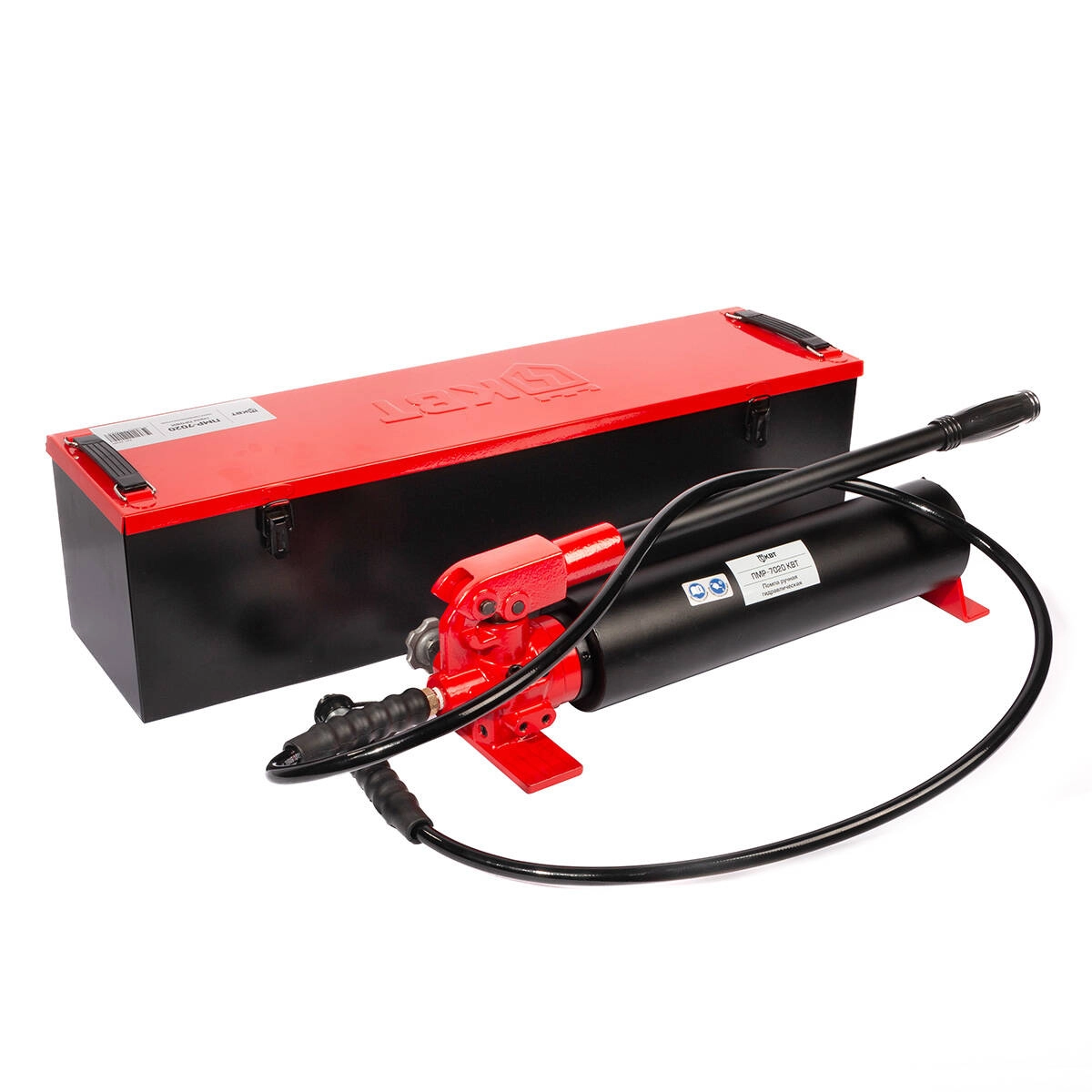 В комплекте: Гидравлическая помпа ПМР-7020 Два рукава высокого давления длиной 1.8 м Стальной кейс 670x220x220 мм