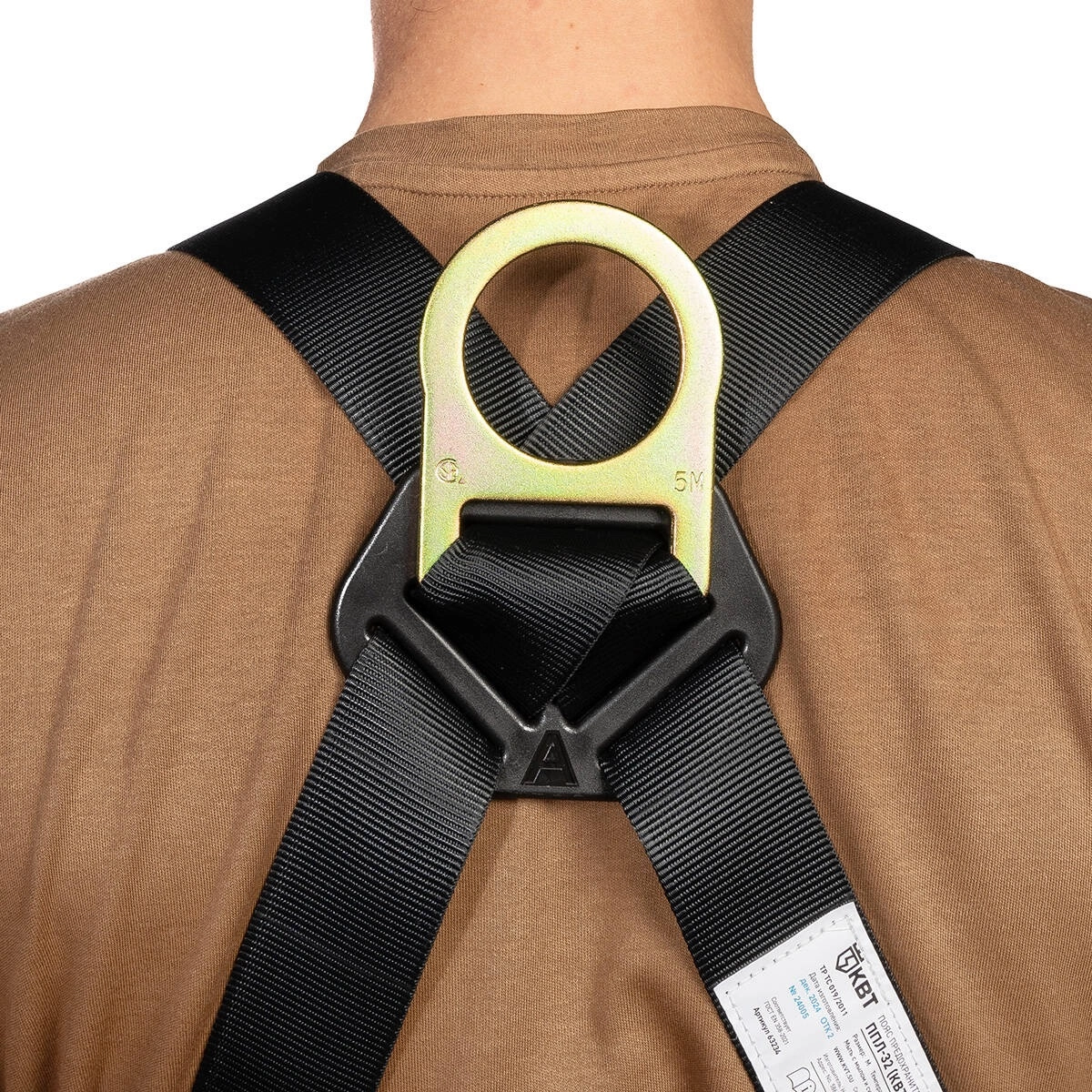 Страховочная привязь с наплечными и набедренными лямками – компонент страховочной системы для охвата тела человека с целью удержания и предотвращения падения с высоты Высокий прочный кушак обеспечивает максимальное удобство при длительном выполнении работ Пояс имеет четыре элемента крепления: два D-образных элемента крепления по бокам привязи, один на спине и анкерную петлю на груди Регулируемые застегивающиеся пряжки на наплечных и набедренных лямках позволяют за минимально короткое время подогнать привязь по размеру Наличие вспомогательной ленты с застежкой на груди позволяет быстро отстегнуть и пристегнуть привязь Строп подбирается индивидуально, исходя из специфики задач Срок службы привязи: 5 лет Статическая нагрузка: не менее 15кН Объем талии: 940-1240 мм Длина кушака: 650 мм Длина ремня: 1420 мм Вес: 2.1 кг Характеристики
