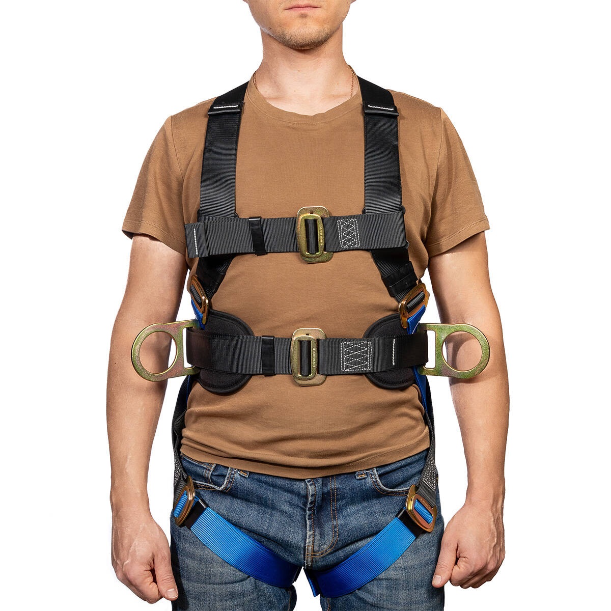 Страховочная привязь с наплечными и набедренными лямками – компонент страховочной системы для охвата тела человека с целью удержания и предотвращения падения с высоты Высокий прочный кушак обеспечивает максимальное удобство при длительном выполнении работ Пояс имеет четыре элемента крепления: два D-образных элемента крепления по бокам привязи, один на спине и анкерную петлю на груди Регулируемые застегивающиеся пряжки на наплечных и набедренных лямках позволяют за минимально короткое время подогнать привязь по размеру Наличие вспомогательной ленты с застежкой на груди позволяет быстро отстегнуть и пристегнуть привязь Строп подбирается индивидуально, исходя из специфики задач Срок службы привязи: 5 лет Статическая нагрузка: не менее 15кН Объем талии: 940-1240 мм Длина кушака: 650 мм Длина ремня: 1420 мм Вес: 2.1 кг Характеристики