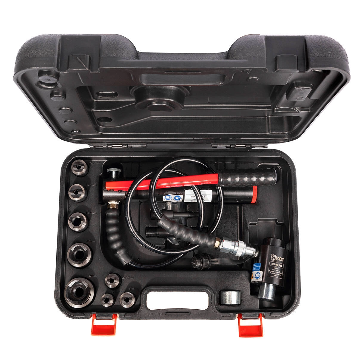 Состав комплекта: гидравлический пресс ППО-60 гидравлическая помпа ПМР-7003 рукав высокого давления длиной 1.3 м набор из 8 сменных перфоформ 2 резьбовые шпильки диаметром 11/20 мм (М10х1/М20х1.5) 1 резьбовая шпилька диаметром 20 мм (М20х1.5) опорная втулка ремкомплект (уплотнительные кольца) прочный пластиковый кейс