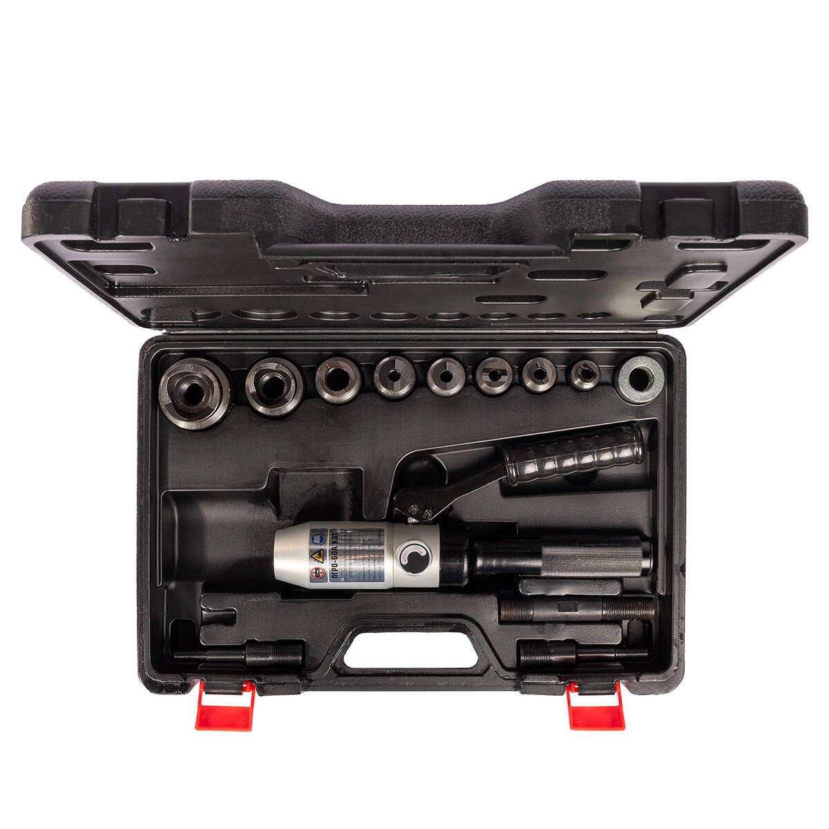 Состав комплекта: гидравлический прямой пресс ПГРО-60А набор из 8 сменных перфоформ 2 резьбовые шпильки диаметром 11/20 мм (М10х1/М20х1.5) 1 резьбовая шпилька диаметром 20 мм (М20х1.5) опорная втулка ремкомплект (уплотнительные кольца) прочный пластиковый кейс