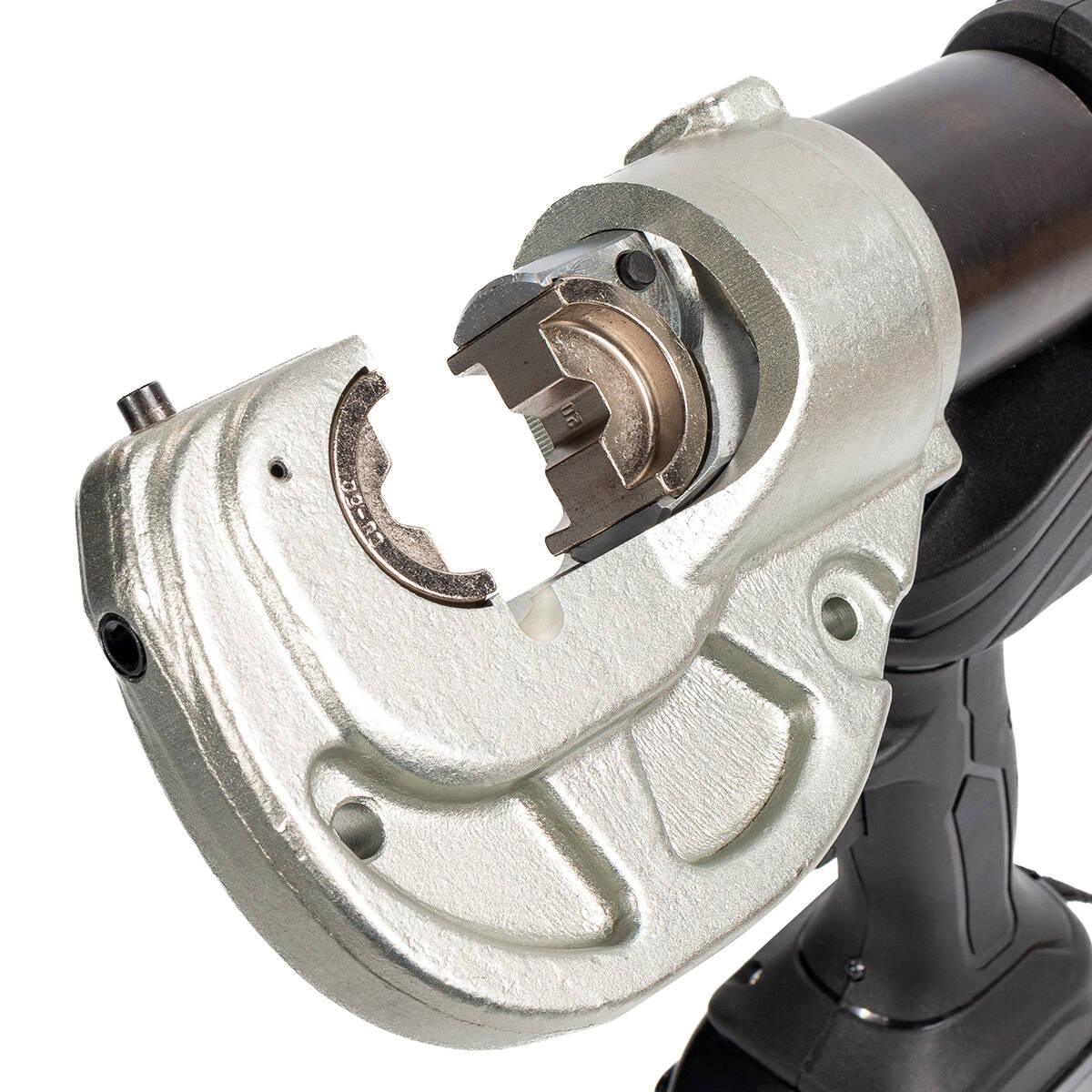 Автоматический возврат штока после завершения операции Механизм автоматического сброса давления (АСД) Кнопка ручного сброса давления Ход поршня: 40 мм Вращающаяся С-образная кованая голова Фиксированные матрицы с опорной полусферой Гексагональная опрессовка Функция экономии энергии Светодиод для подсветки рабочей зоны опрессовки Корпус инструмента выполнен из прочного пластика, армированного стекловолокном Широкое основание корпуса 105х295 мм и прорезиненные ножки обеспечивают устойчивое положение инструмента во время работы На задней части корпуса расположен разъем для подключения ручного пульта дистанционного управления ПУР-2 (КВТ) Отпускание кнопки «Пуск» мгновенно прекращает работу инструмента и останавливает опрессовку Сетодиод-индикатор заряда батареи Обновленное универсальное зарядное устройство на 14.4–18 вольт со звуковой индикацией при подключении и зарядке батареи. 9 мелодий на выбор Максимальное усилие: 13 т Время опрессовки: 8-12 сек Время зарядки аккумулятора: 80 мин Вес аккумуляторов: 0.58 кг Вес комплекта/инструмента: 14.90/8.80 кг Длина: 520 мм Габариты кейса: 600х400х130 мм Характеристики