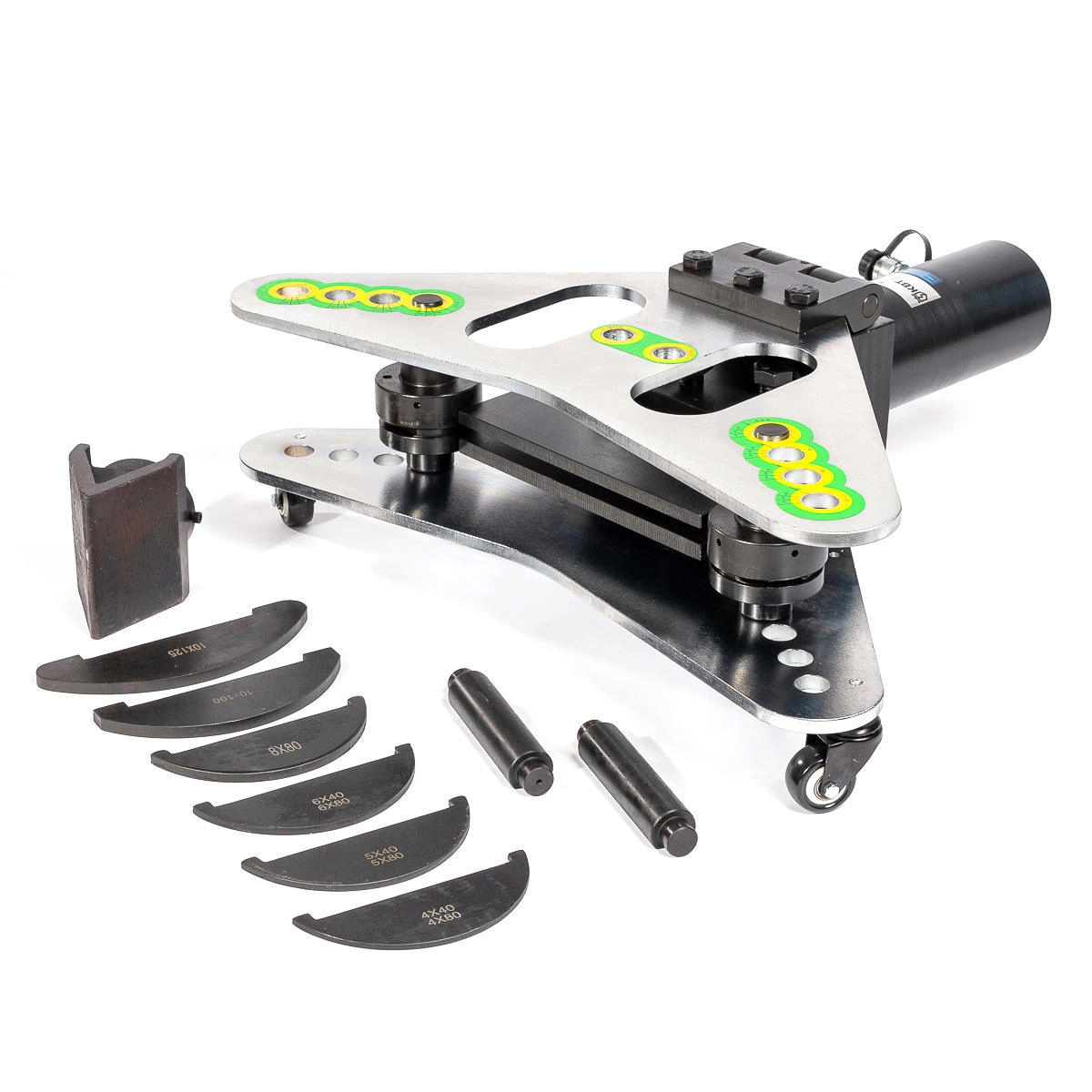 В комплекте: пресс для гибки ШГР-125 профили для гибки на ребро, 6 шт: 4х40-80/5х40-80/6х40-80/8х80/10х100/12х125 мм матрица для гибки на плоскость 2 шпильки диаметром 10 и 18 мм