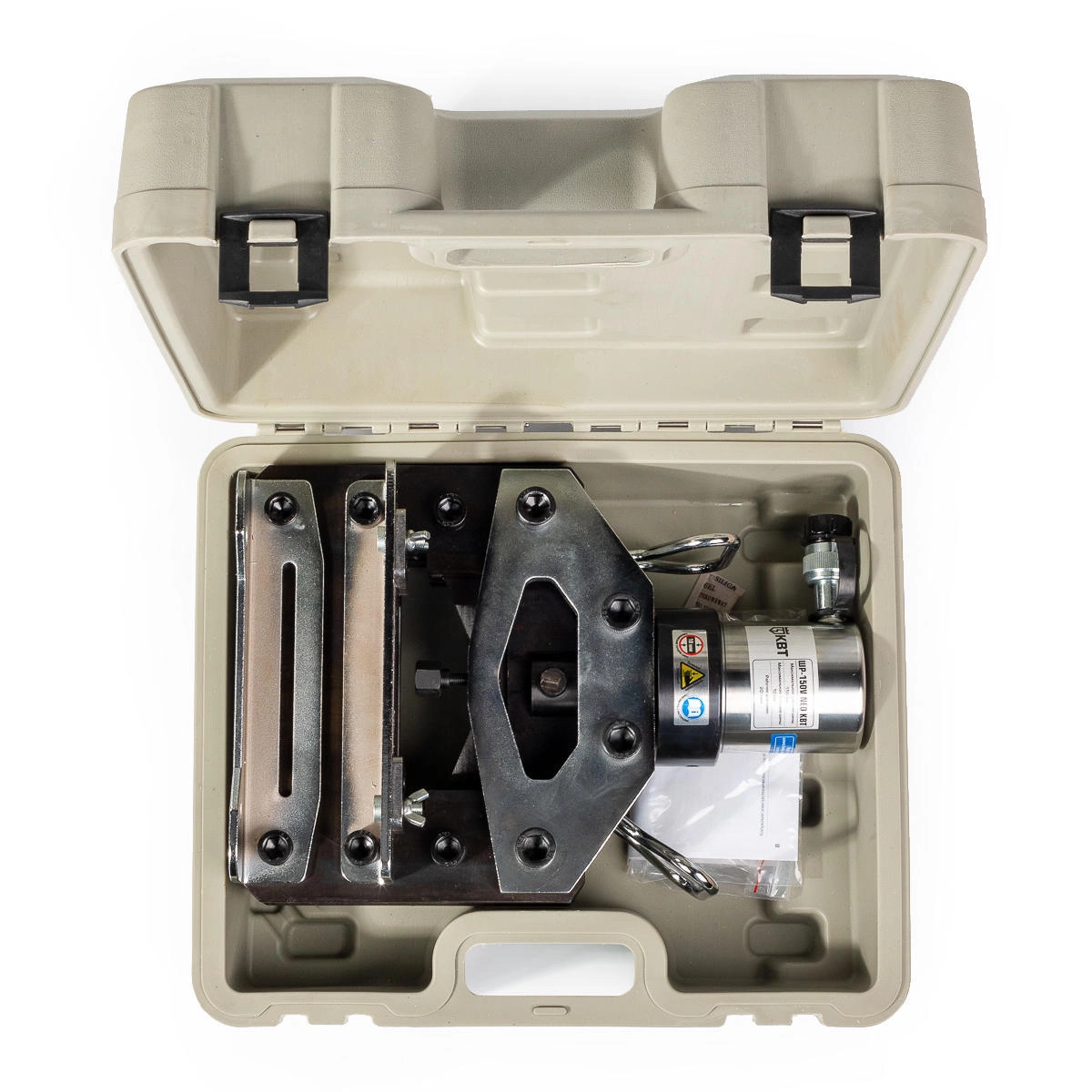 Тип лезвий: V-образный, гильотинный с высечкой Возможность стационарного крепления пресса к рабочему столу Рез шины без замятий и заусенцев После резки шины образуется высечка шириной 9 мм Самоцентрирующаяся конструкция ножа После резки шина не требует дополнительной обработки Максимальное усилие: 20 т Вес инструмента: 28.7 кг Упаковка: пластиковый кейс Габариты упаковки: 420х360х195 мм Совместимость: любые гидравлические насосы «КВТ» с объемом рабочей жидкости не менее 0.60 л Характеристики