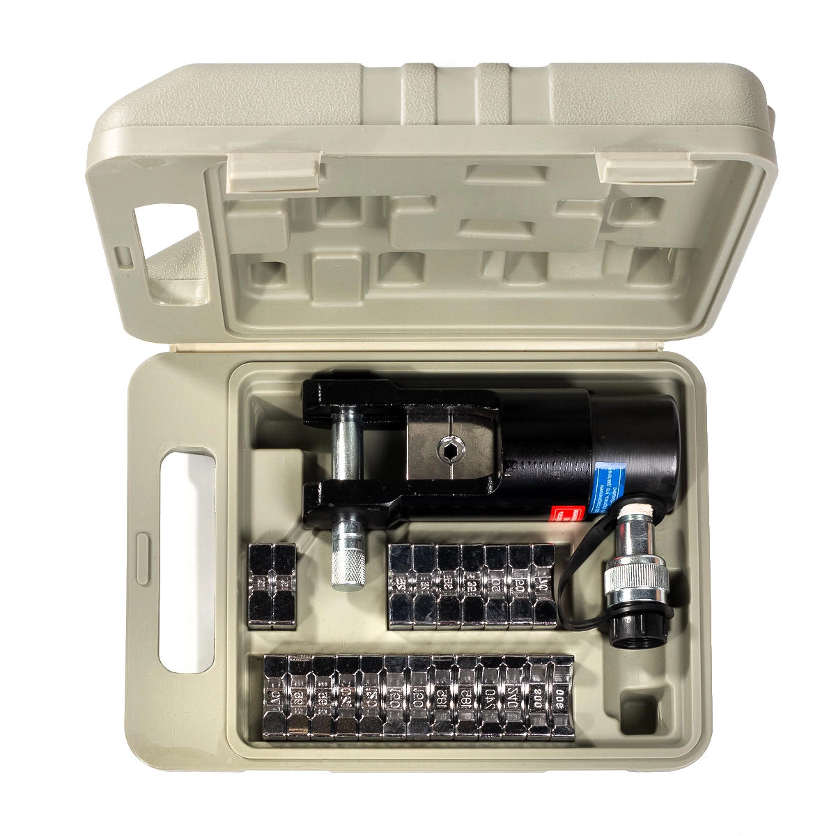 В комплекте: гидравлический пресс ПГ-300 набор из 12 сменных шестигранных матриц прочный пластиковый кейс