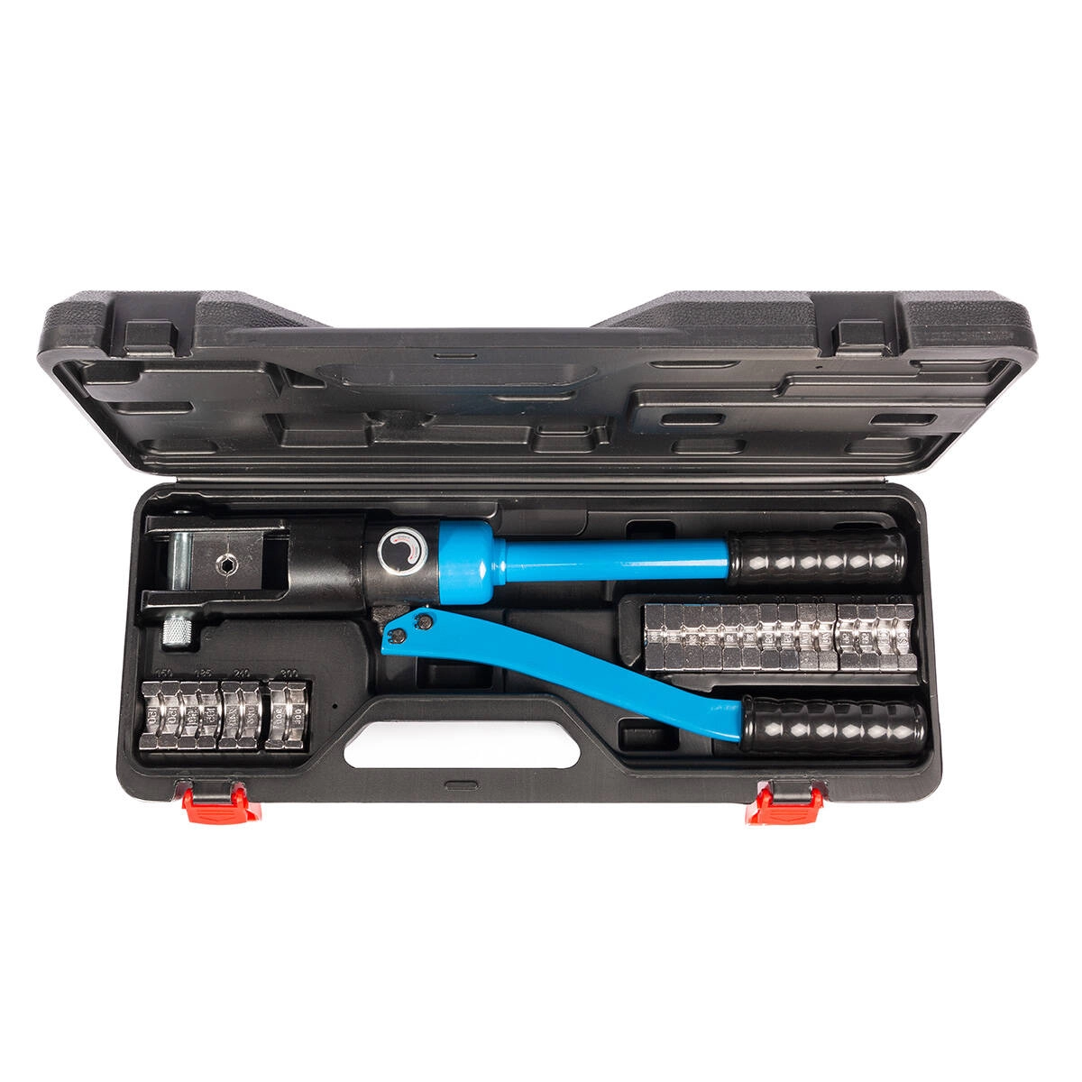 В комплекте: ручной гидравлический пресс ПГР-300 набор из 12 сменных шестигранных матриц ремкомплект (уплотнительные кольца) прочный пластиковый кейс