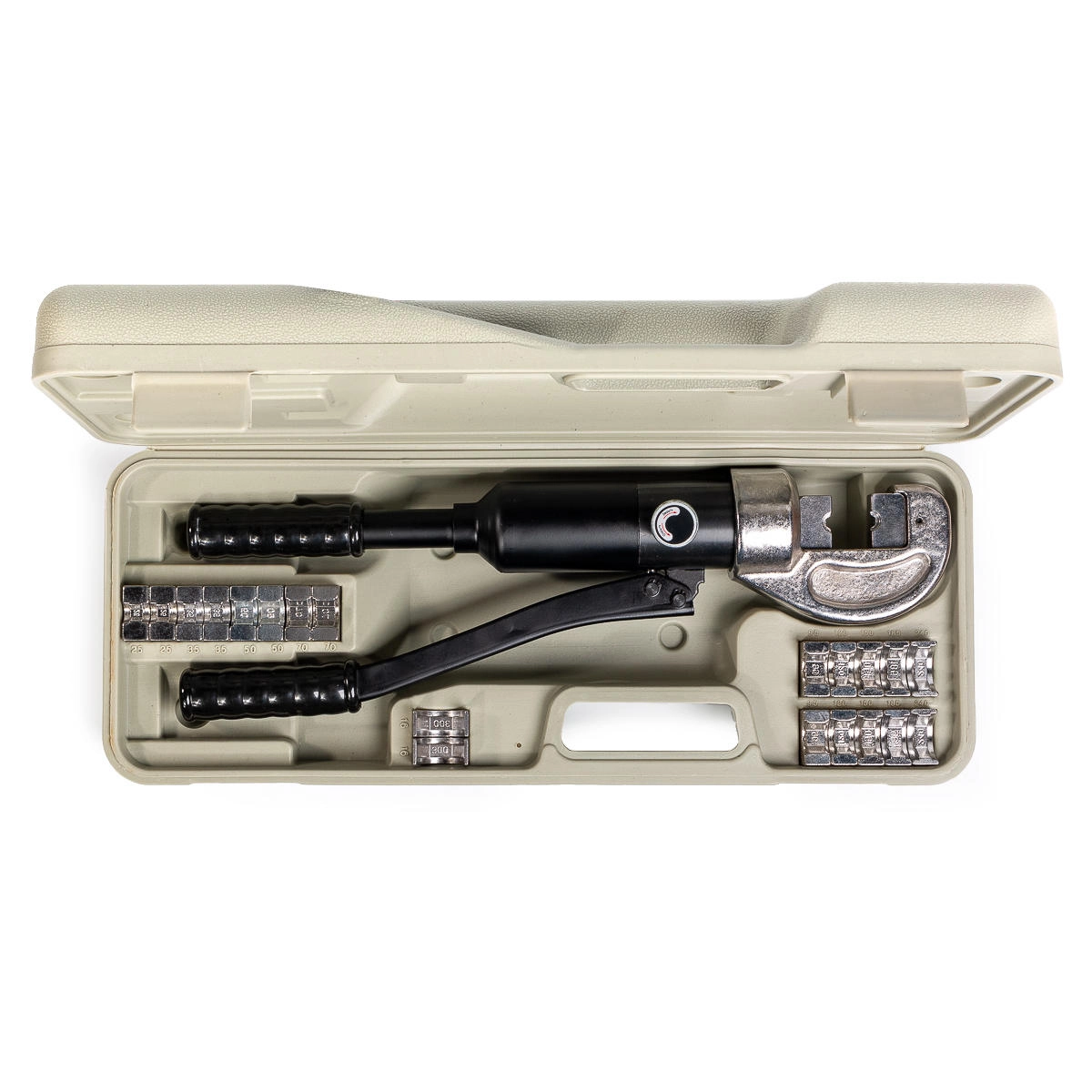 В комплекте: ручной гидравлический пресс ПГРс-300у набор из 11 сменных шестигранных матриц ремкомплект (уплотнительные кольца) прочный пластиковый кейс