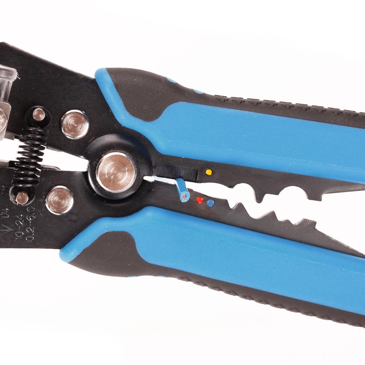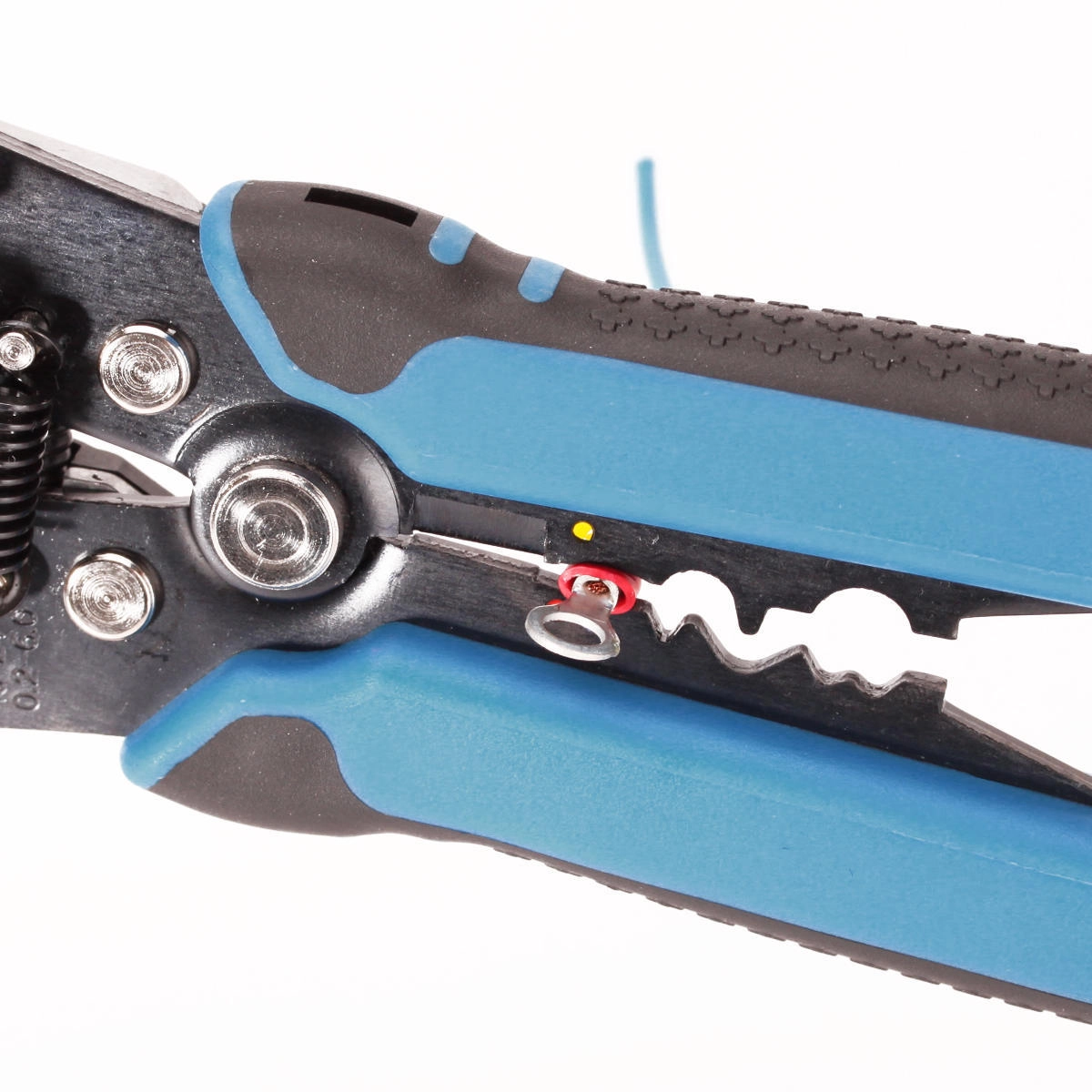 В стандартном диапазоне 0.2–6 мм2: автоматическая настройка на нужный размер и толщину изоляции проводов В микродиапазоне проводов от 0.05 мм2 и для сечения 10 мм2 используется винт микронастройки Снятие изоляции с моножильных и многопроволочных жил без повреждения проводника Усиленные прижимные губки с шириной захвата 13 мм Окно для сброса обрезков изоляции, благодаря которому снятая изоляция не застревает в механизме Одновременная зачистка нескольких проводов за одно движение, благодаря широким прижимным губкам Функция частичного снятия изоляции. Надрез и смещение Снятие изоляции с середины провода Две встроенные возвратные пружины с увеличенным ресурсом работы Типы опрессуемых наконечников: изолированные наконечники с красной, синей и желтой манжетами неизолированные наконечники автоклеммы под двойной обжим