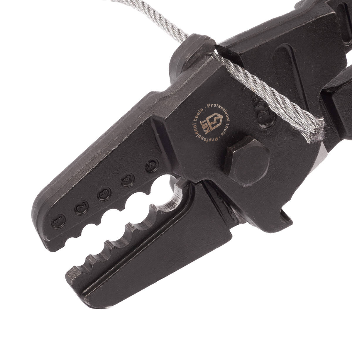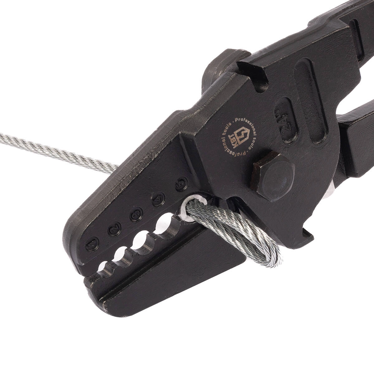 -Предназначен для опрессовки стальных тросов овальными алюминиевыми и медными втулками