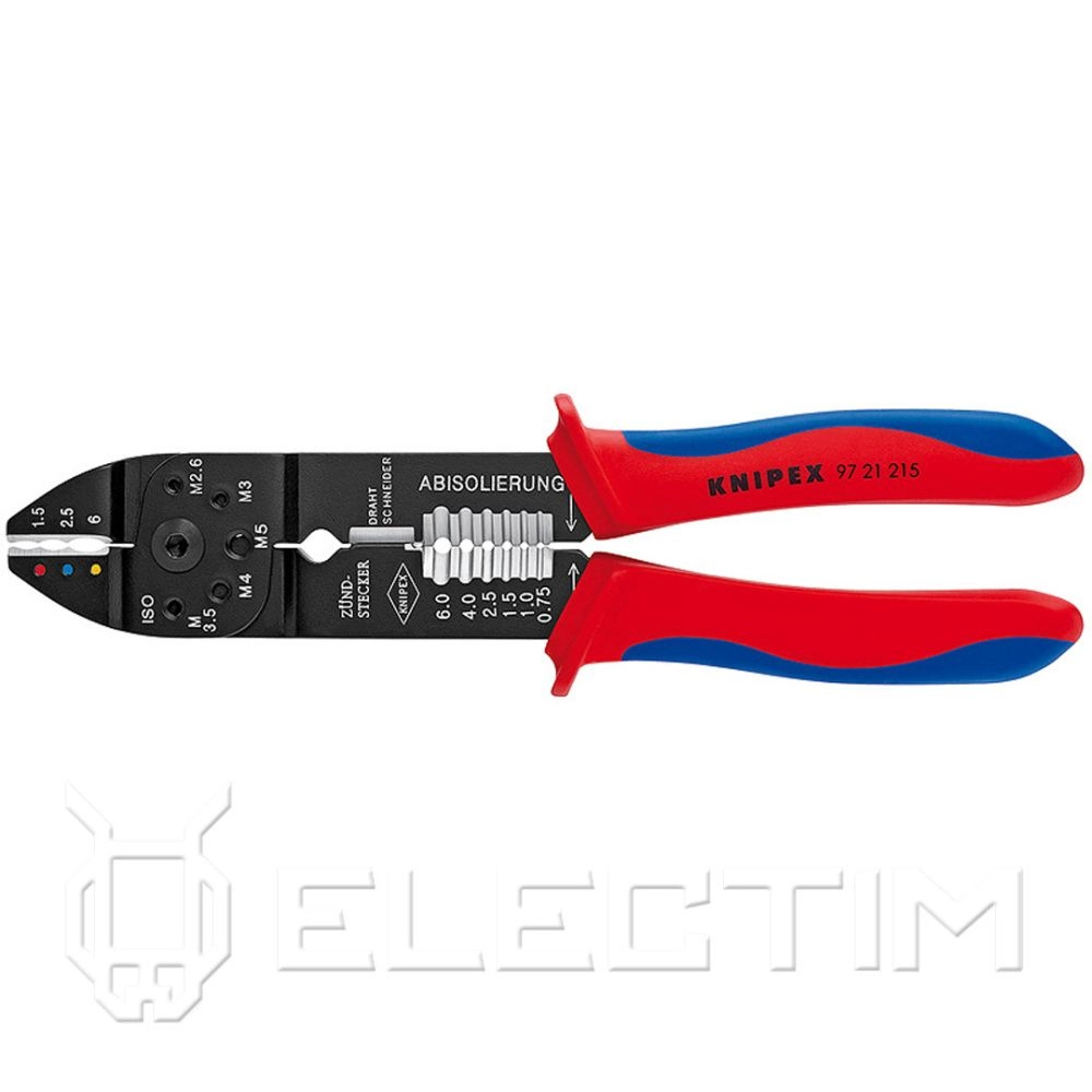 ПроизводителиПресс-клещи для резки и зачистки кабеля, 3 гнезда, 230мм, чёрные, 2-комп. рукоятки (9721215) KNIPEX