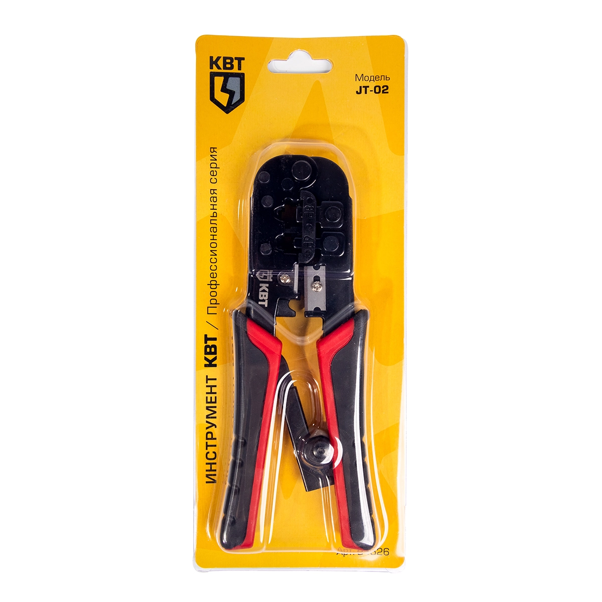 JT-02 Многофункциональные пресс-клещи с двумя встроенными модулями для обжима RJ-разъемов, КВТ 84626 — легкие и компактные пресс-клещи 4 в 1, применяются для: обжима разъемов RJ снятия изоляции с плоских телефонных проводов снятия оболочки с круглых проводов типа UTP, STP резки проводов