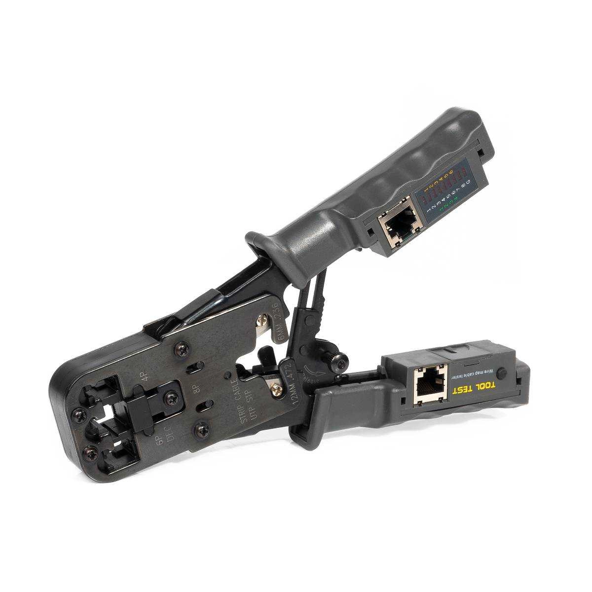 JT-03T Пресс-клещи с 3 встроенными модулями и съемным тестером для витой пары, КВТ 84493 — обжимные клещи 5 в 1, применяются для: обжима разъемов RJ-45, RJ-12, RJ-11 снятия изоляции с плоских телефонных проводов снятия оболочки с круглых проводов типа UTP, STP резки проводов тестирования кабельных линий
