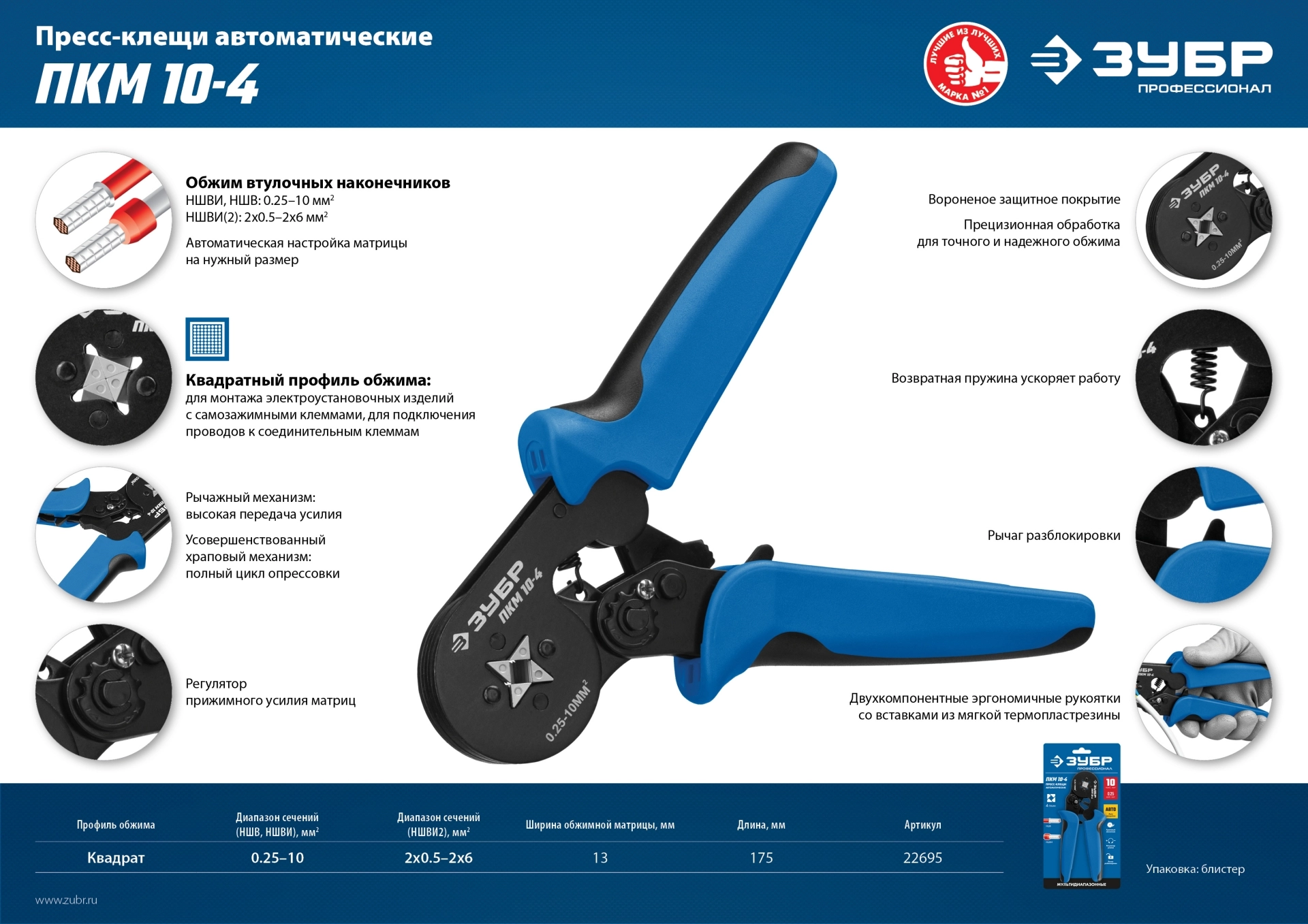 ПроизводителиПресс-клещи мультидиапазонные с шестигранным профилем, 0.25 - 10 мм2 (22695) ЗУБР