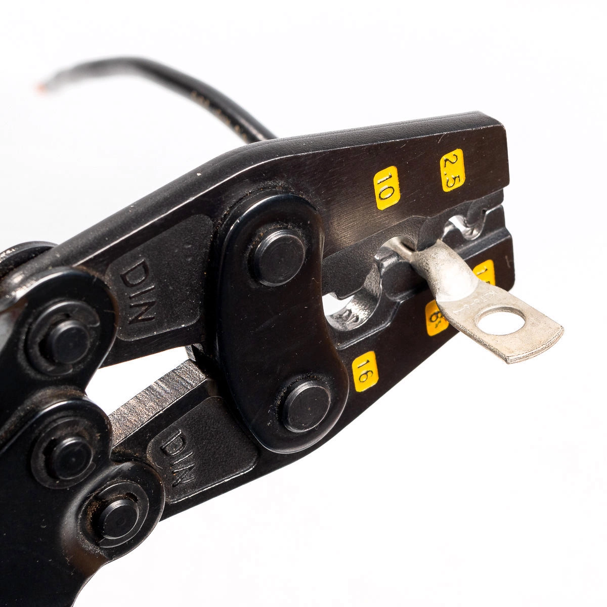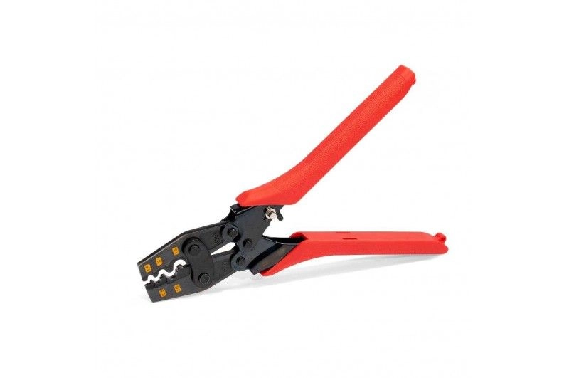 Характеристики КВТ ПК-16у: Диапазон сечений: медные наконечники 1.5–16 мм2 5-позиционные опрессующие губки Опрессовка наконечников и гильз любого стандарта Клиновидный обжим Скрытый храповый механизм обеспечивает более высокое передаточное усилие и гарантирует полный цикл опрессовки Рычаг для экстренной разблокировки матриц Обработка поверхности: воронение Эргономичные рукоятки Вес: 390 г Длина: 245 мм Характеристики