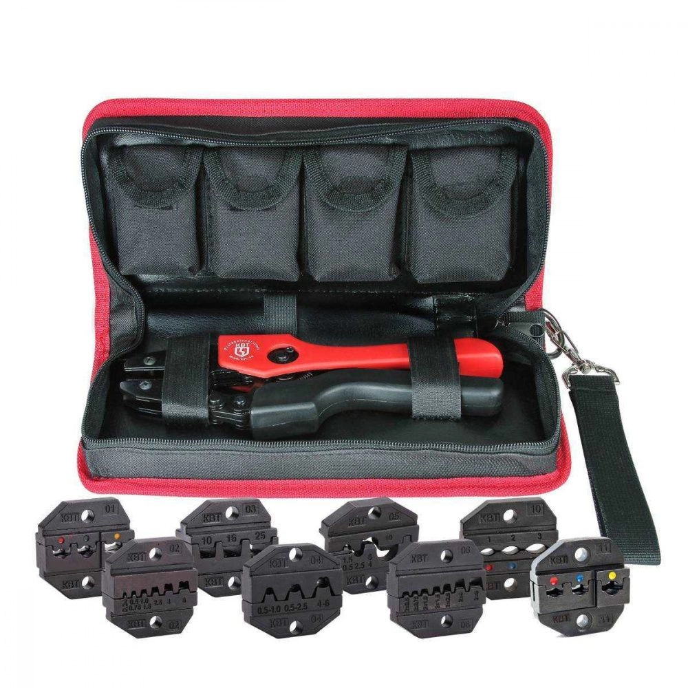 Набор СТК+8 Пресс-клещи с наборами матриц в прочной тканевой сумке, КВТ 83347 — набор предназначен для опрессовки изолированных наконечников, гильз и разъемов, втулочных наконечников, неизолированных медных наконечников