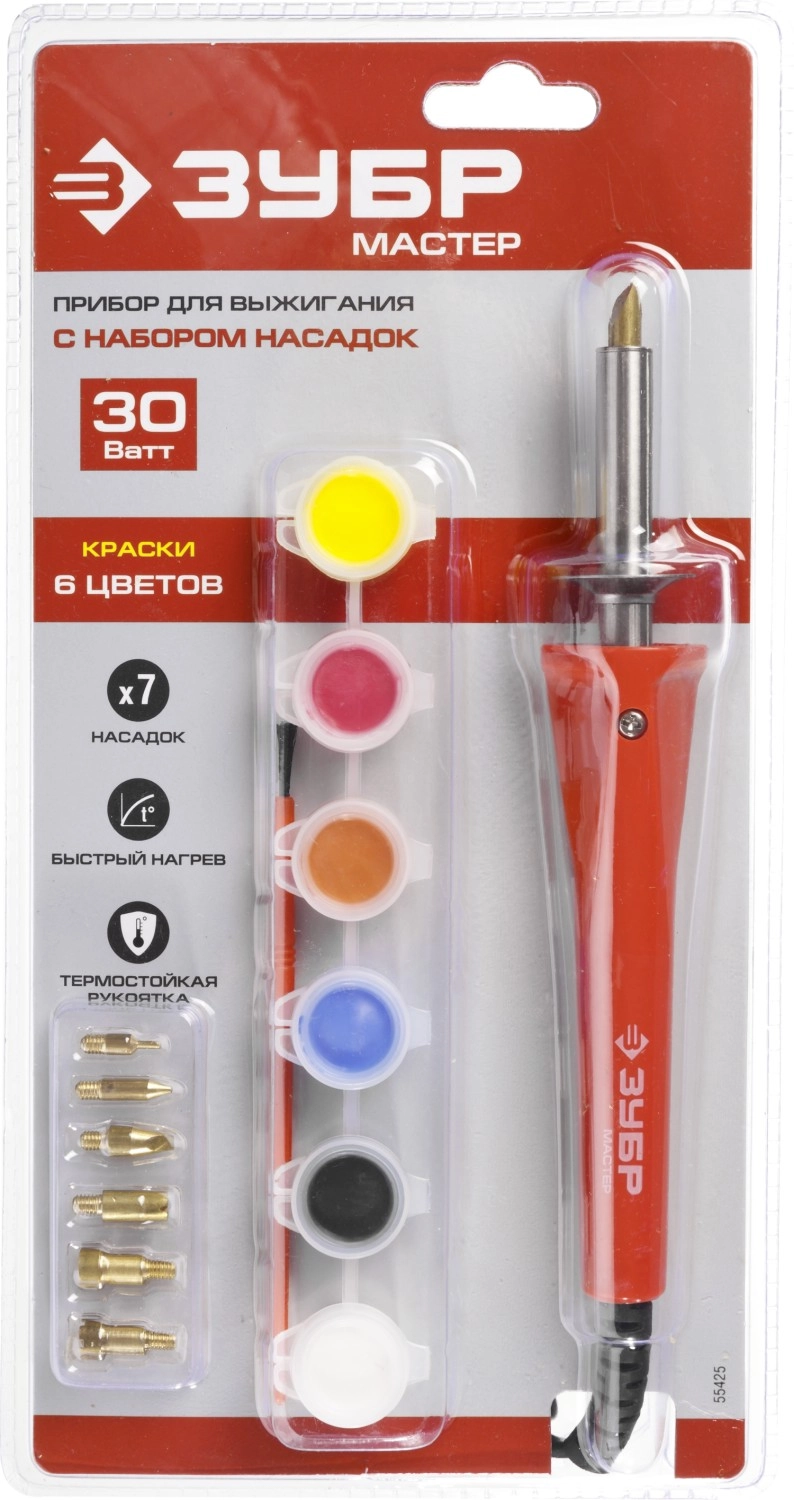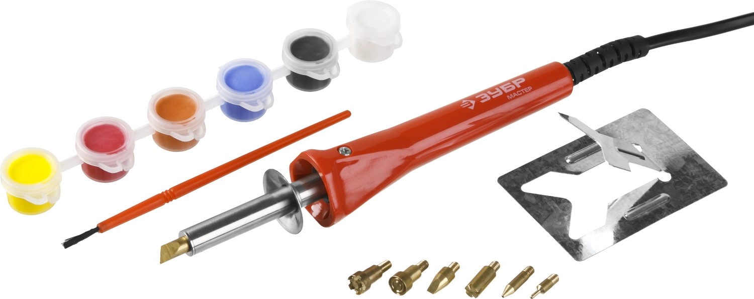 ПроизводителиПрибор для выжигания, 30Вт, с набором насадок 7шт. и красками "МАСТЕР" (55425) ЗУБР