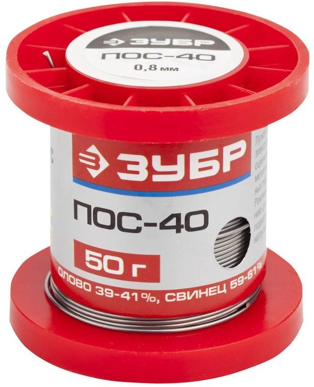 ПроизводителиПрипой ПОС 40, проволока, 50г, 0,8мм (55451-050-08) ЗУБР